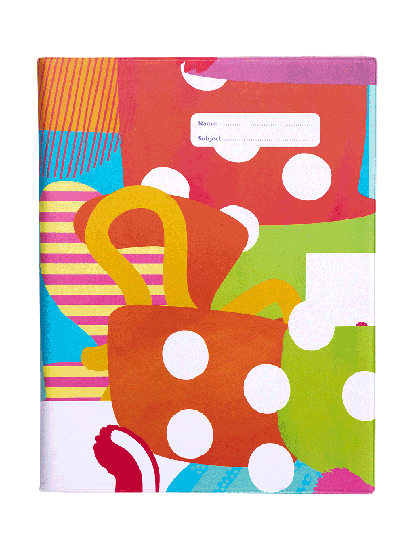 9x7 Exercise Book Cover - Colourburst 2: An explosion of colour and shapes, Colourburst will inspire your kids' artistic and creative side! Don't wrestle with pesky, sticky book covering when you can cover books in just 10 seconds with this reusable, slip-on school book cover! It's a total game-changer. The perfect fit for exercise books (commonly known as 9x7" exercise books), it is made from from non-toxic certified PVC Reach material. It will surely make back to school easy for you and fun for the kids!