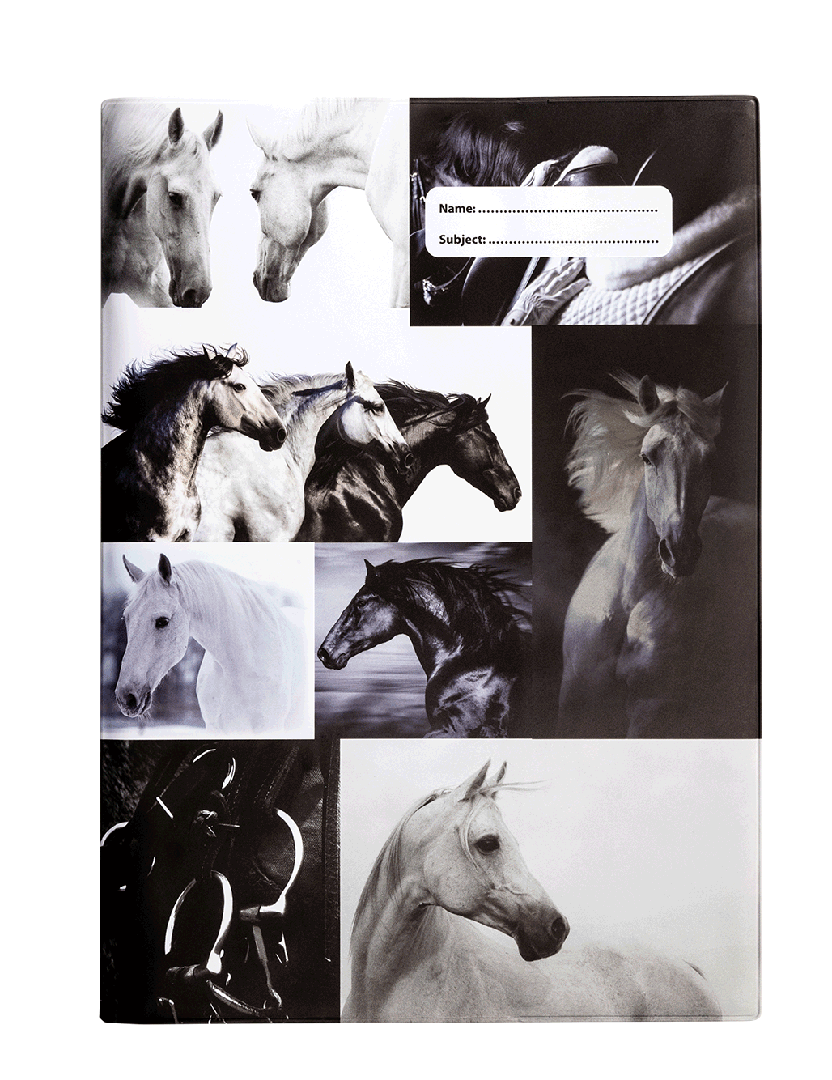A4 Book Cover - Black & White Horses 4: Horse-lovers go mad for Black & White Horses, the perfect montage of beautiful images in a black and white colour-scheme that primary and tween kids adore. Don't wrestle with pesky, sticky book covering when you can cover books in just 10 seconds with this reusable, slip-on school book cover! It's a total game-changer. In A4 size, it fits A4 exercise books and is made from non-toxic certified PVC Reach material. It will surely make back to school easy for you and fun for the kids!
