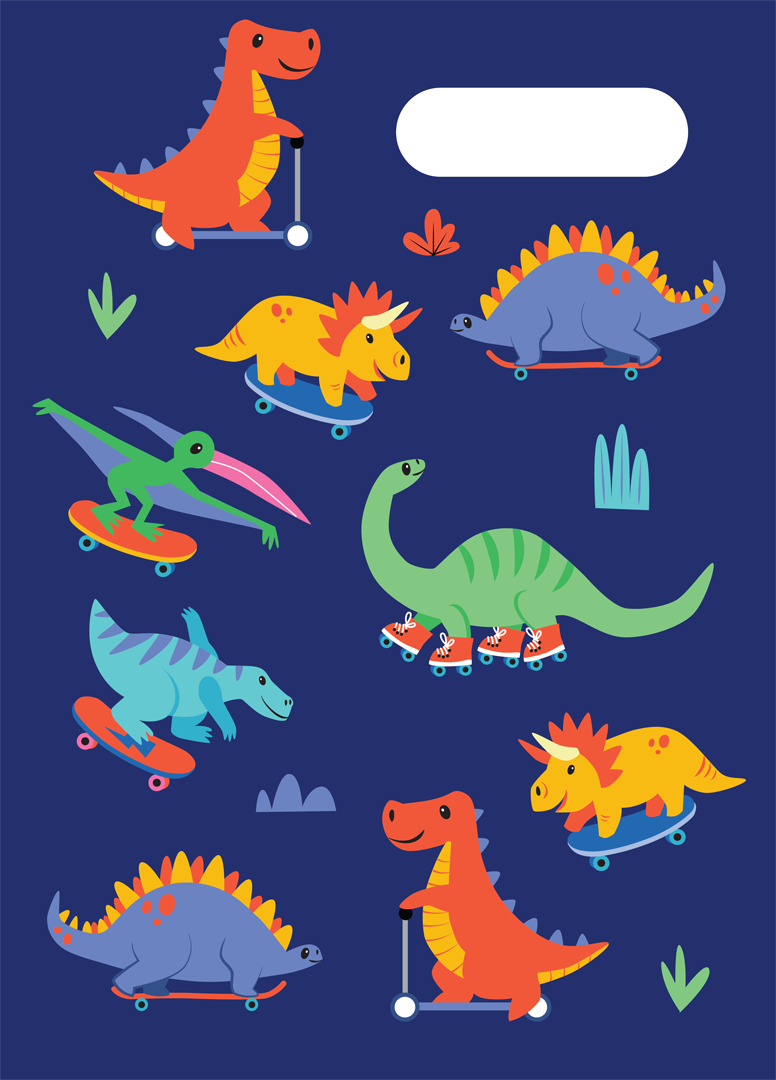 A4 Book Cover - Dino Skate Park: Don't wrestle with pesky, sticky book covering when you can cover books in just 10 seconds with this reusable, slip-on school book cover! It's a total game-changer. In A4 size, it fits A4 exercise books and is made from non-toxic certified PVC Reach material. It will surely make back to school easy for you and fun for the kids!