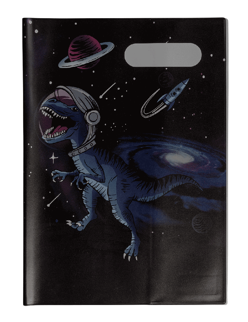 A4 Book Cover - ExtraT-REXtrial 1: Once upon a time, dinosaurs roamed the Earth…and in space! Let their imaginations soar with this Extra T-Rextrial space adventure! Don't wrestle with pesky, sticky book covering when you can cover books in just 10 seconds with this reusable, slip-on school book cover! It's a total game-changer. In A4 size, it fits A4 exercise books and is made from non-toxic certified PVC Reach material. It will surely make back to school easy for you and fun for the kids!