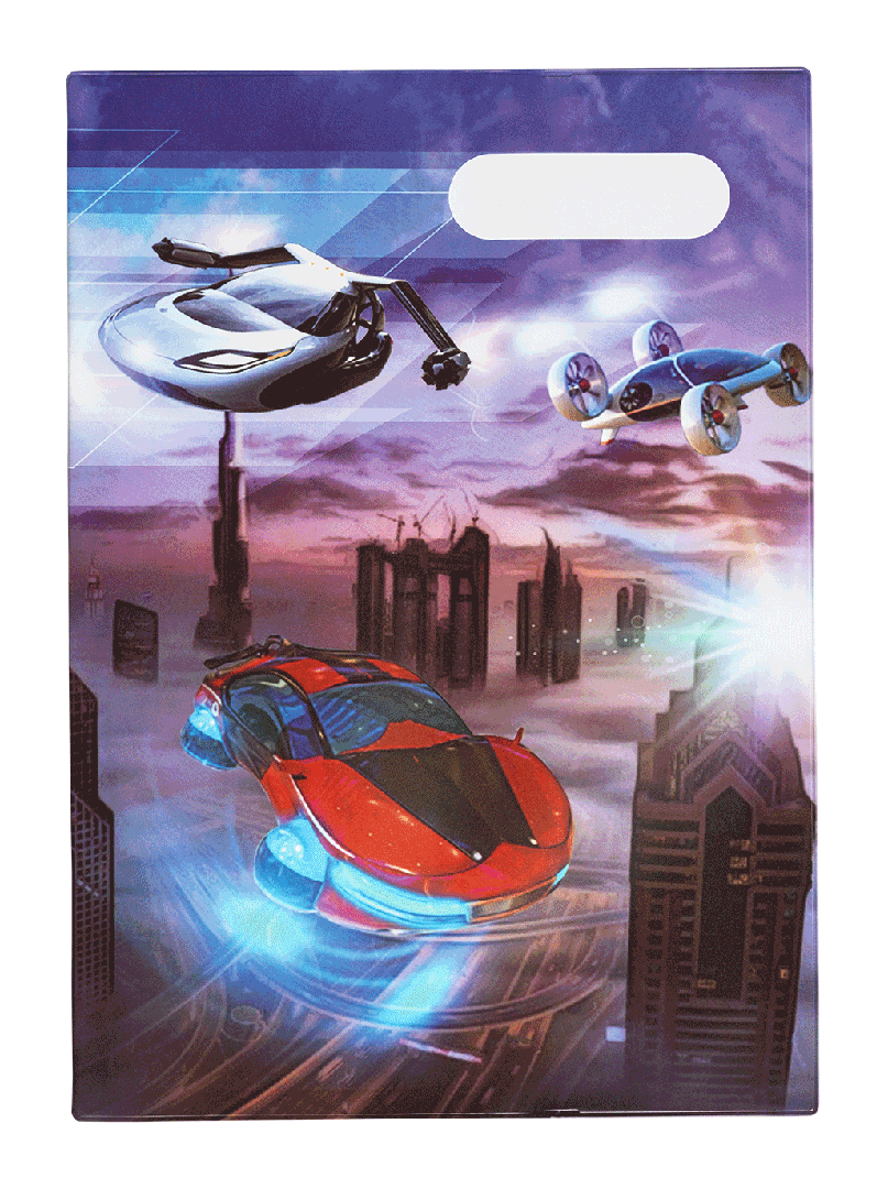 A4 Book Cover - Flying Cars: Let their imaginations soar as high as the clouds… like flying cars in a futuristic world! Perfect for lovers of sci-fi and super-cool wheels! Don't wrestle with pesky, sticky book covering when you can cover books in just 10 seconds with this reusable, slip-on school book cover! It's a total game-changer. In A4 size, it fits A4 exercise books and is made from non-toxic certified PVC Reach material. It will surely make back to school easy for you and fun for the kids!