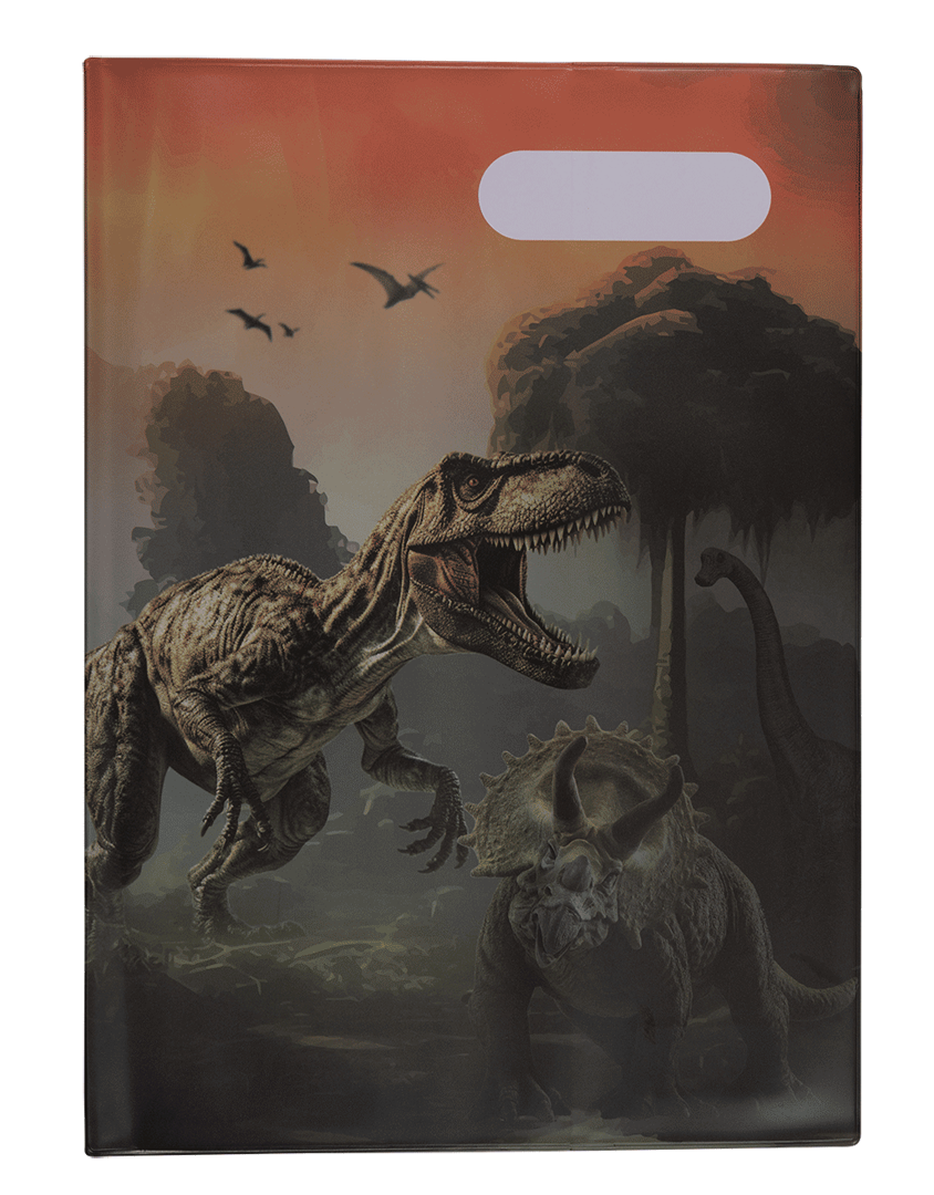 A4 Book Cover - Jurassic Kingdom: This fun and adventurous dinosaur design is perfect for dino-loving kids! Whether your child dreams of exploring prehistoric lands or simply loves the roar of a T-Rex, Jurassic Kingdom is sure to bring delight to them every day. Don't wrestle with pesky, sticky book covering when you can cover books in just 10 seconds with this reusable, slip-on school book cover! It's a total game-changer. In A4 size, it fits A4 exercise books and is made from non-toxic certified PVC Reach material. It will surely make back to school easy for you and fun for the kids!