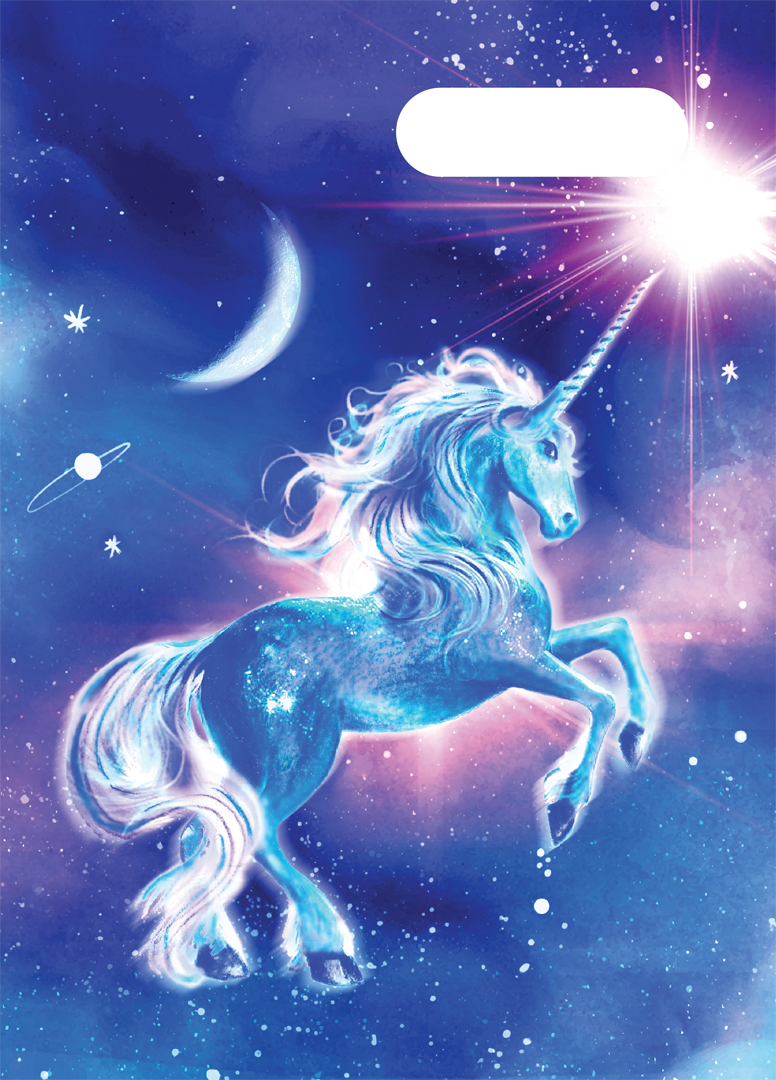 A4 Book Cover - Moonlit Unicorn: Under a starlit sky, magic comes to life! Moonlit Unicorn is a dreamy swirl of twilight colours, sparkling stars and one truly majestic unicorn. It's pure enchantment for kids who believe in a universe full of wonder. Don't wrestle with pesky, sticky book covering when you can cover books in just 10 seconds with this reusable, slip-on school book cover! It's a total game-changer. In A4 size, it fits A4 exercise books and is made from non-toxic certified PVC Reach material. It will surely make back to school easy for you and fun for the kids!