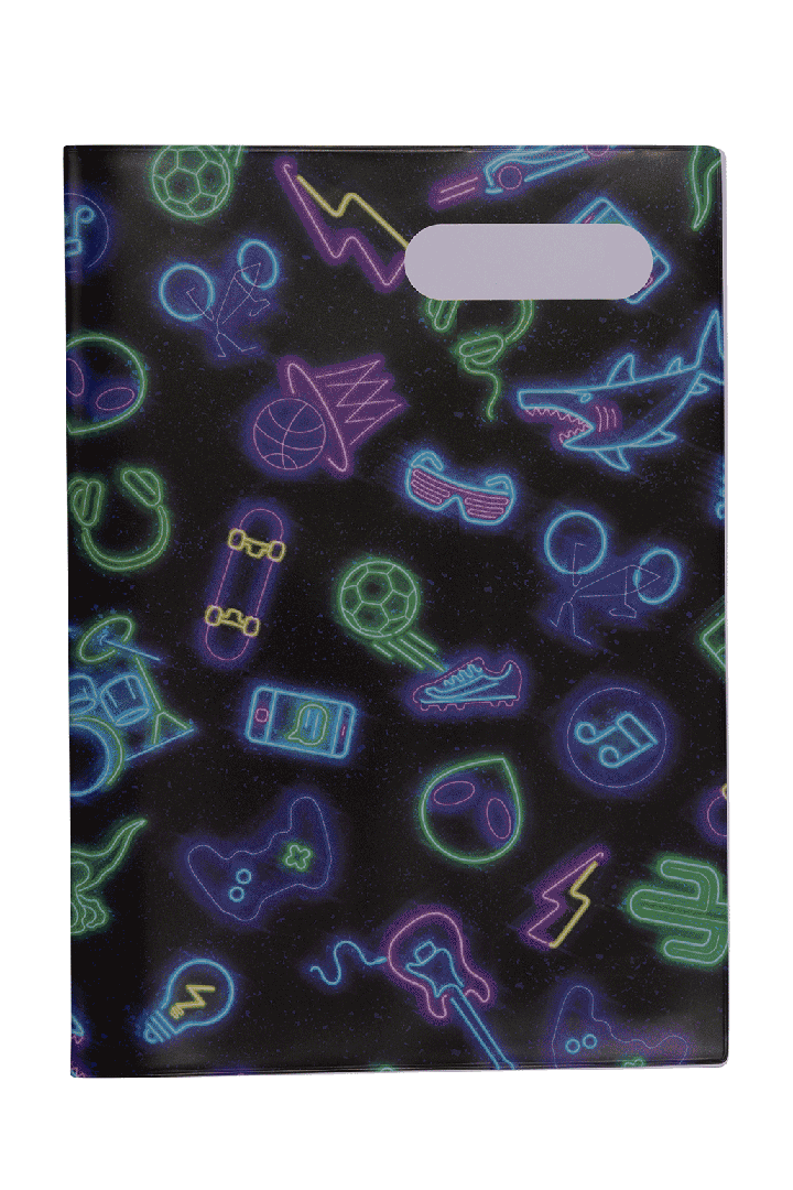 A4 Book Cover - Neon Life 1: Don't wrestle with pesky, sticky book covering when you can cover books in just 10 seconds with this reusable, slip-on school book cover! It's a total game-changer. In A4 size, it fits A4 exercise books and is made from non-toxic certified PVC Reach material. It will surely make back to school easy for you and fun for the kids!