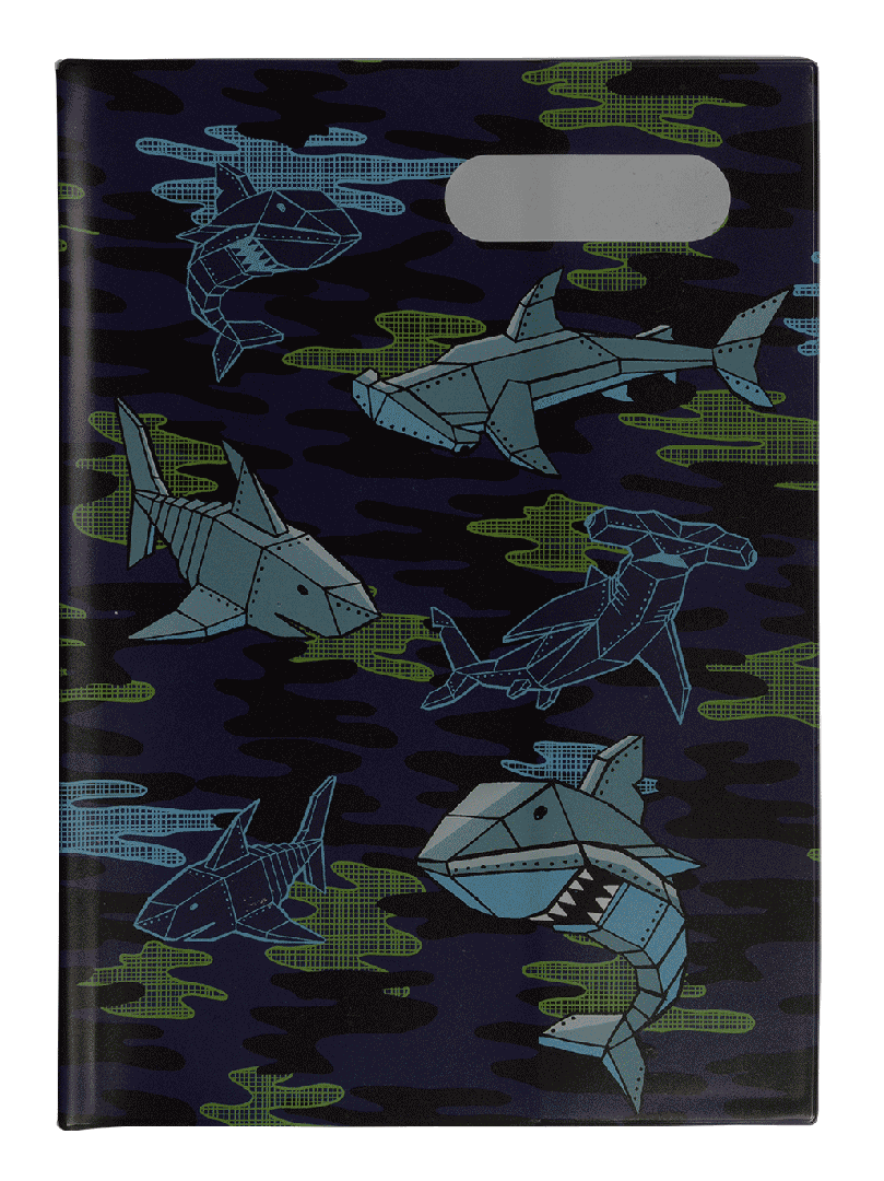 A4 Book Cover - Robo Shark 1: Is there anything more awe-inspiring than a shark? YEP: a ROBO-SHARK! These fishies make every day fin-tastic! Don't wrestle with pesky, sticky book covering when you can cover books in just 10 seconds with this reusable, slip-on school book cover! It's a total game-changer. In A4 size, it fits A4 exercise books and is made from non-toxic certified PVC Reach material. It will surely make back to school easy for you and fun for the kids!
