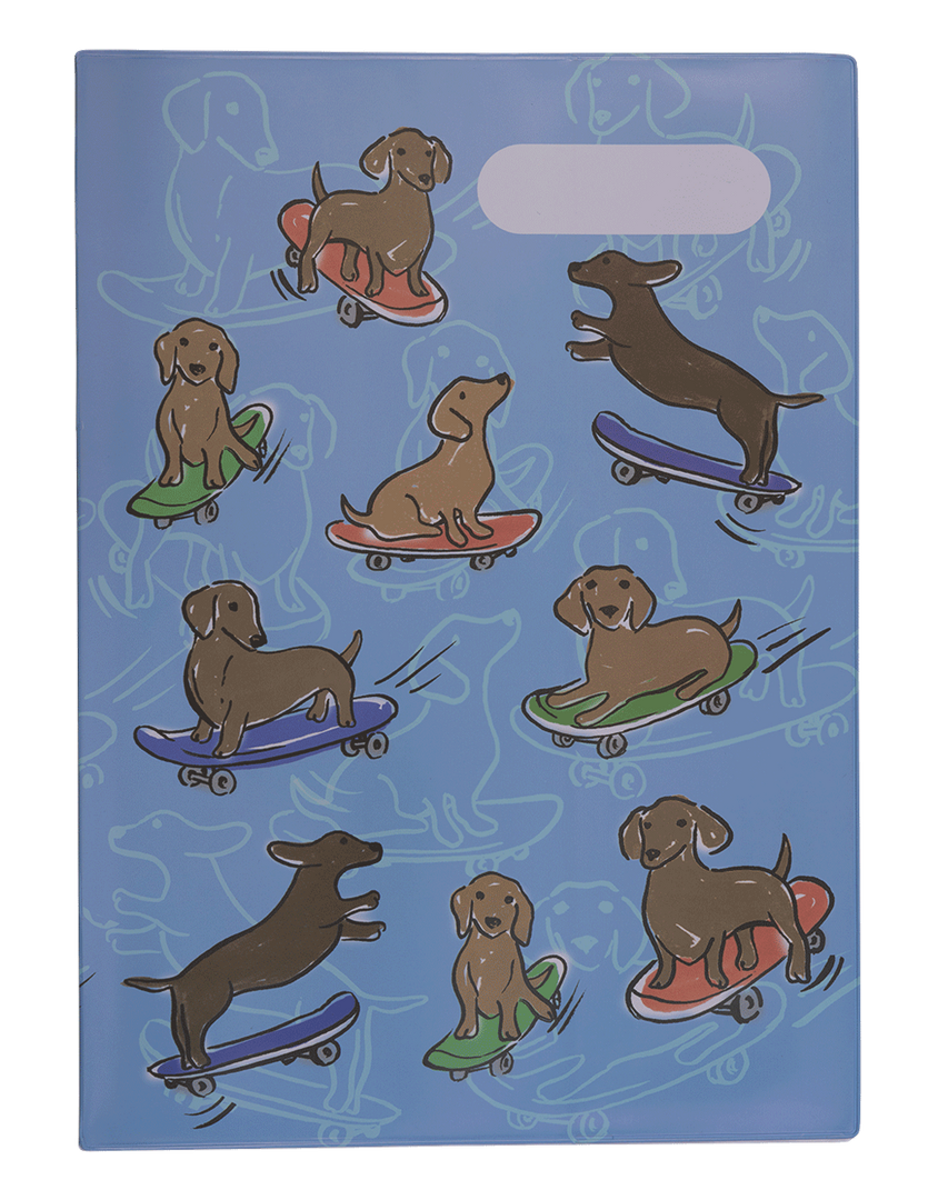 A4 Book Cover - Skate Dogs: Don't wrestle with pesky, sticky book covering when you can cover books in just 10 seconds with this reusable, slip-on school book cover! It's a total game-changer. In A4 size, it fits A4 exercise books and is made from non-toxic certified PVC Reach material. It will surely make back to school easy for you and fun for the kids!