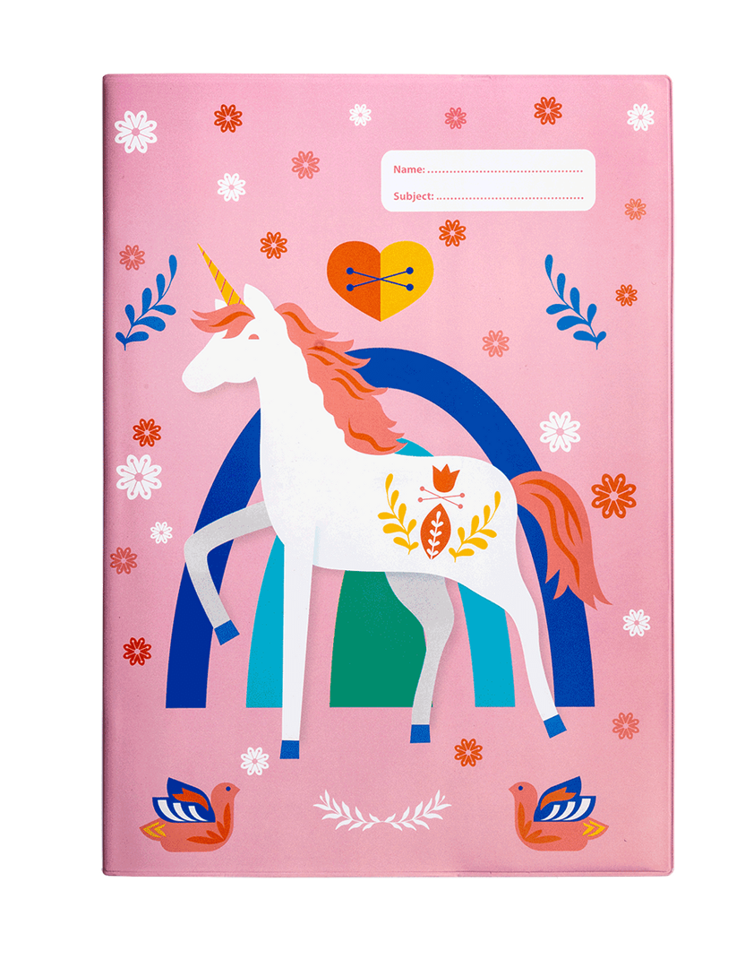 A4 Book Cover - Unicornia 3: Unicornia is a special place where dreams are made and anything is possible. Full of magic and wonder, pretty unicorns prance and dance in a faraway land. Don't wrestle with pesky, sticky book covering when you can cover books in just 10 seconds with this reusable, slip-on school book cover! It's a total game-changer. In A4 size, it fits A4 exercise books and is made from non-toxic certified PVC Reach material. It will surely make back to school easy for you and fun for the kids!