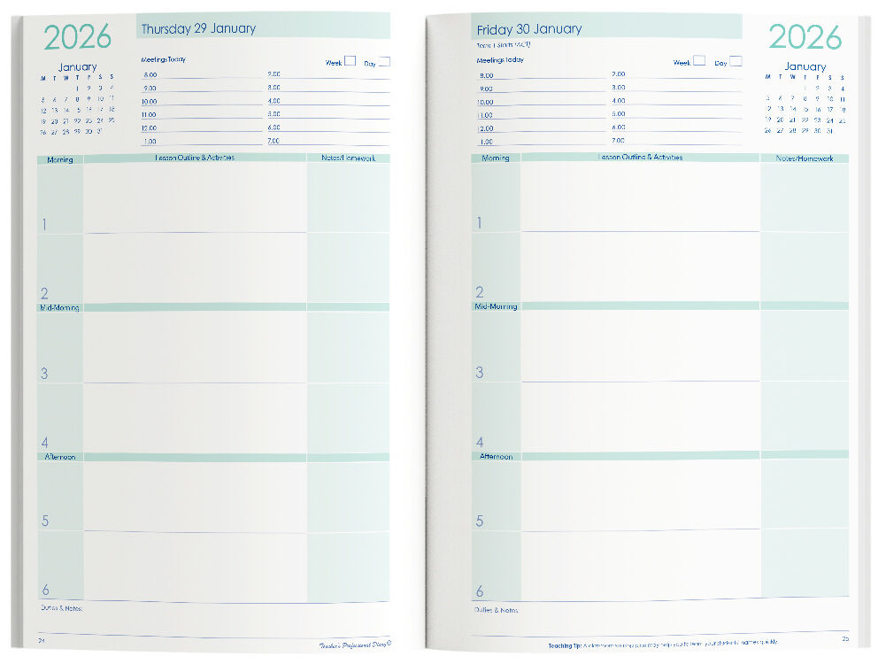 The A5 Pure Paperback Planner (Daily) is slim, lightweight, and practical — ideal for teachers who want an uncluttered planner without unnecessary extras. With its 6-period day-to-a-page layout, it offers structure, flexibility, and dedicated space for notes and meetings.