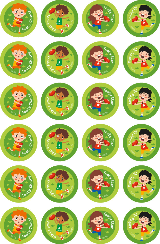 Score big with our 'AFL Football - Extracurricular Stickers' pack. This sporty set features 96 stickers, each with a 29mm diameter, across 4 sheets. Celebrate every goal and tackle with stickers that showcase vibrant illustrations of young players in action, complete with fun sayings like "Footy Champ" and "Kicking It!". These Australian-designed stickers are great for coaches and teachers to encourage teamwork, effort, and sportsmanship on and off the field.