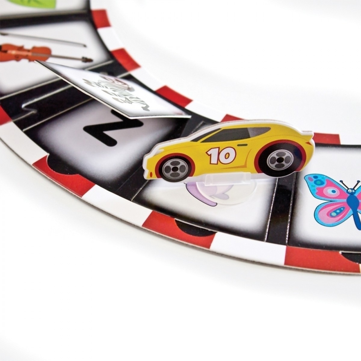 - Contains 13 interchangeable cardboard racetrack pieces, 3 accessories, 4 playing pieces, die and instruction guide.