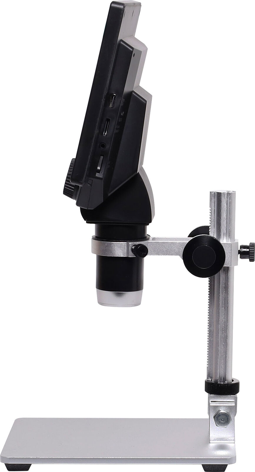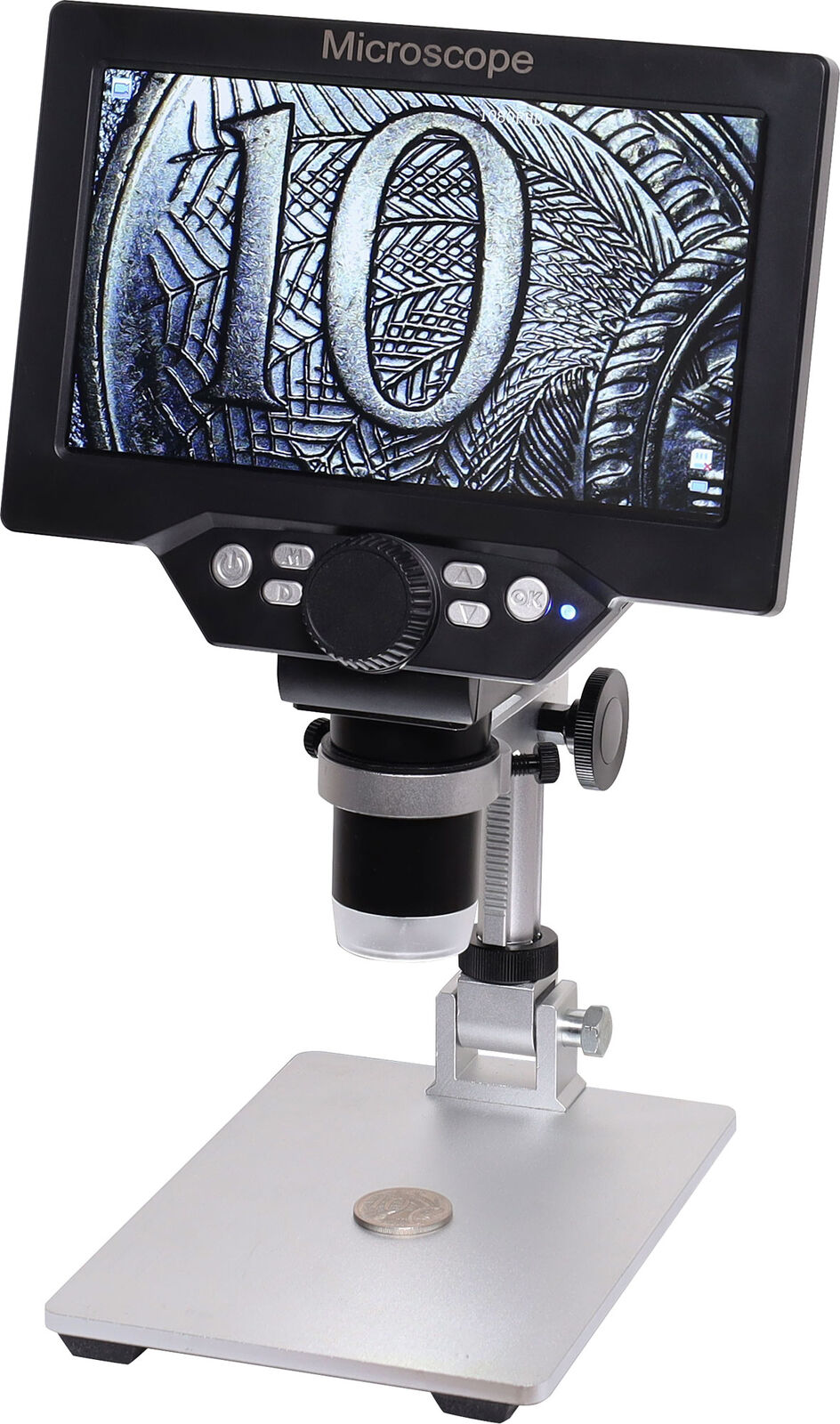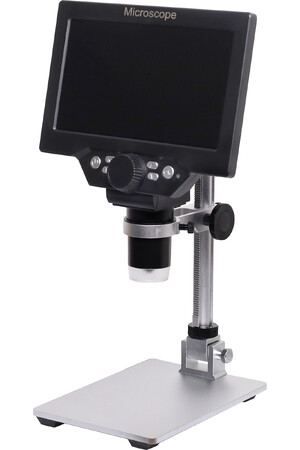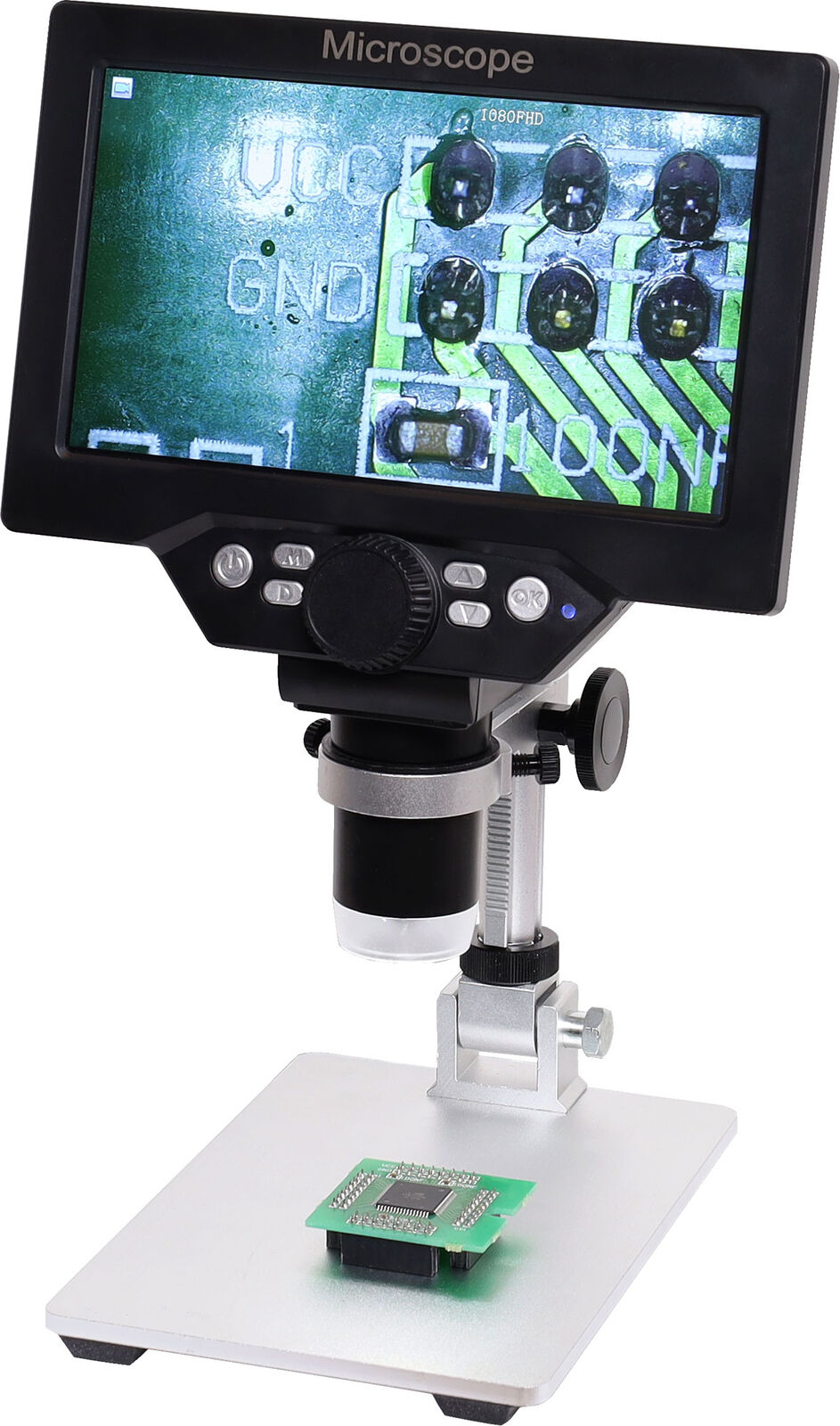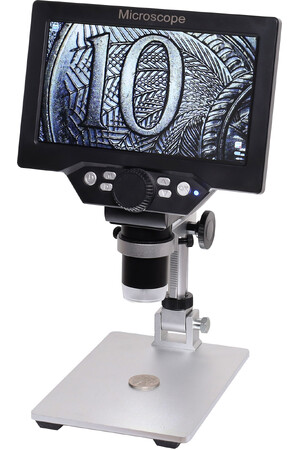 This digital microscope offers a 12MP camera and up to 1200X continuous magnification, letting you visually inspect fine details on virtually anything. Great for tasks such as PCB inspection, science classroom use and much more. Its built-in 7-inch colour HD display (1024×600 resolution) shows a live feed, which can be recorded to microSD card (either photos or video. Max 64GB, not included). Bright LEDs provide enhanced lighting, and an adjustable bracket allows angle variation up to 45° for flexibility working with tools underneath. For added flexibility it can be connected to a PC via USB for use as an on-screen camera.