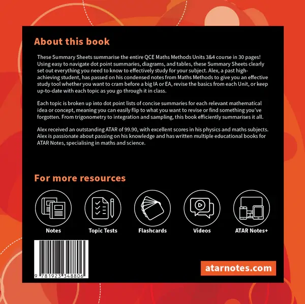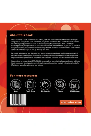 These Summary Sheets summarise the entire QCE Maths Methods Units 3&4 course in 30 pages! Using easy to navigate dot point summaries, diagrams, and tables, these Summary Sheets clearly set out everything you need to know to effectively study for your subject. Alex, a past high-achieving student, has passed on his condensed notes from Maths Methods to give you an effective study tool whether you want to cram before a big IA or EA, revise the basics from each Unit, or keep up-to-date with each topic as you go through it in class.