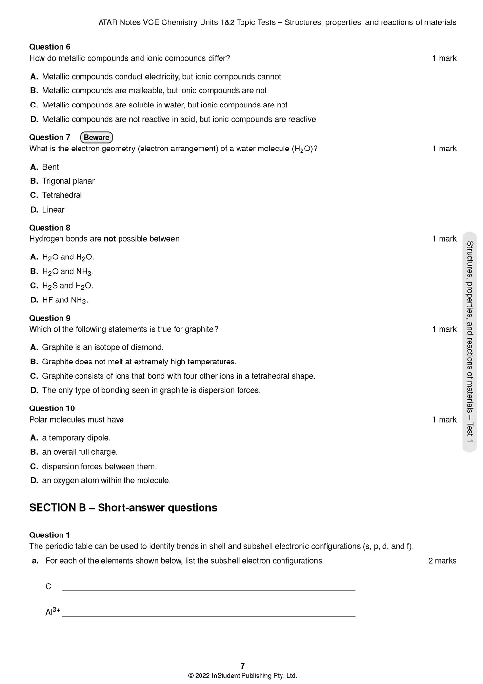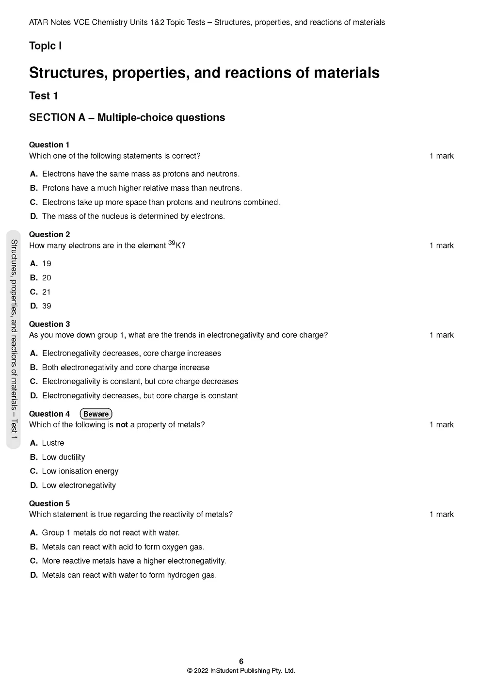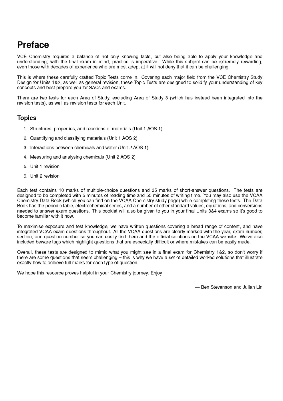 These Topic Tests are designed to enhance your knowledge of the Chemistry 1&2 VCE course. Each test includes questions adapted from past VCAA exams and original questions you won’t find anywhere else. Best of all, for every question, you will find a detailed solution and step-by-step instructions for approaching similar questions in your assessment tasks, as well as expert advice from two past high-achieving students.
