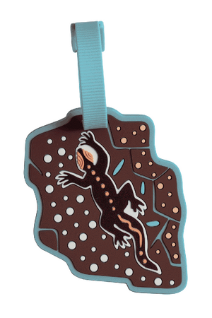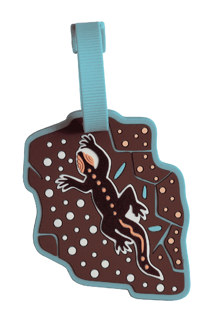 Bag Tag - Kalkatungu Muu: Kalkatungu Muu is the original painting by 15-year-old Jesse Sutton, a contemporary Indigenous artist from the Kalkadoon people from Mount Isa in Queensland. “Kalkatungu Muu” means “Kalkadoon Country” in the Kalkadoon language and Jesse’s painting is his interpretation of the lands of his people. This stunning collection features earthy tones, native animals and symbolism of the land and people of the Mount Isa region.