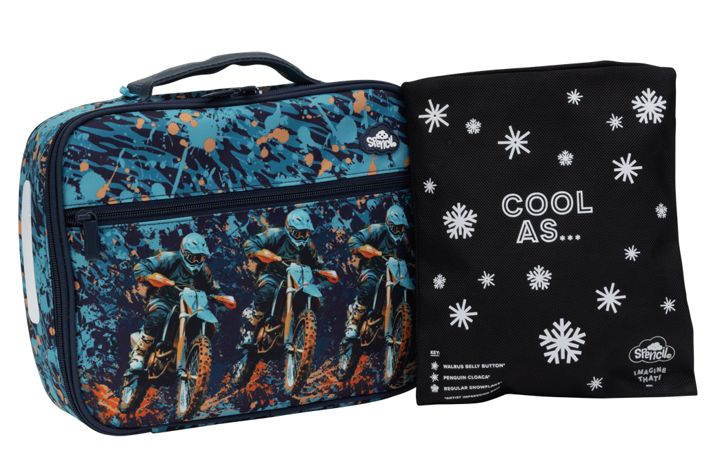 Big Cooler Lunch Bag + Chill Pack - Moto Camo Trax: Packed with wild colours and rugged vibes, Moto Camo Trax is made for kids who love the thrill of biking and aren't afraid to get a little muddy along the way. Adventure-ready and full of fun!