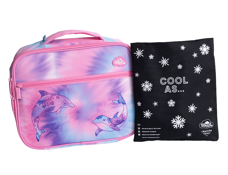 Big Cooler Lunch Bag + Chill Pack-Tie Dye Splash: Make a splash with Tie-Dye Splash! This design swirls together pastel tones with playful dolphins dancing through the waves. Perfect for those who love the ocean and want to ride the wave of fun and colour!