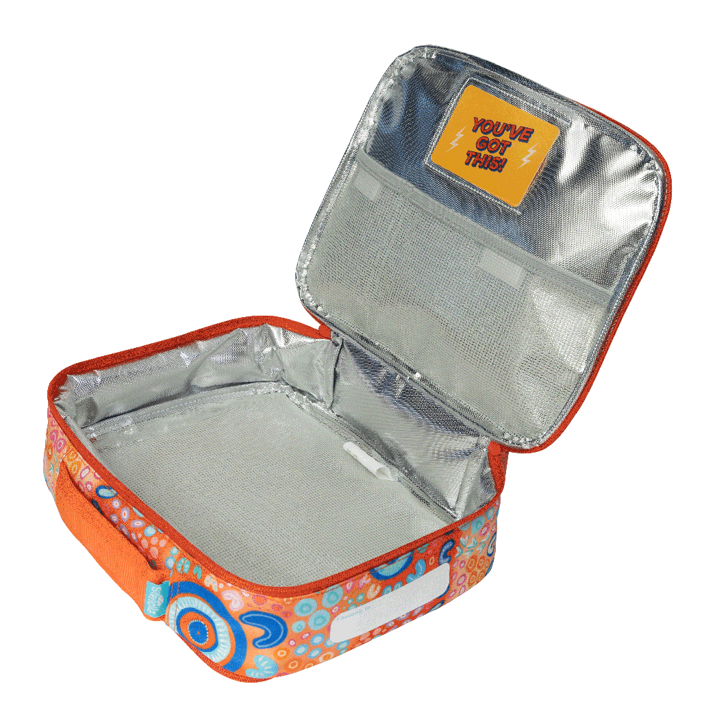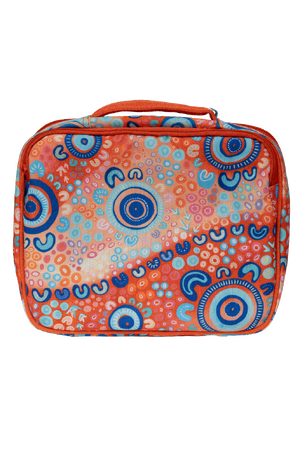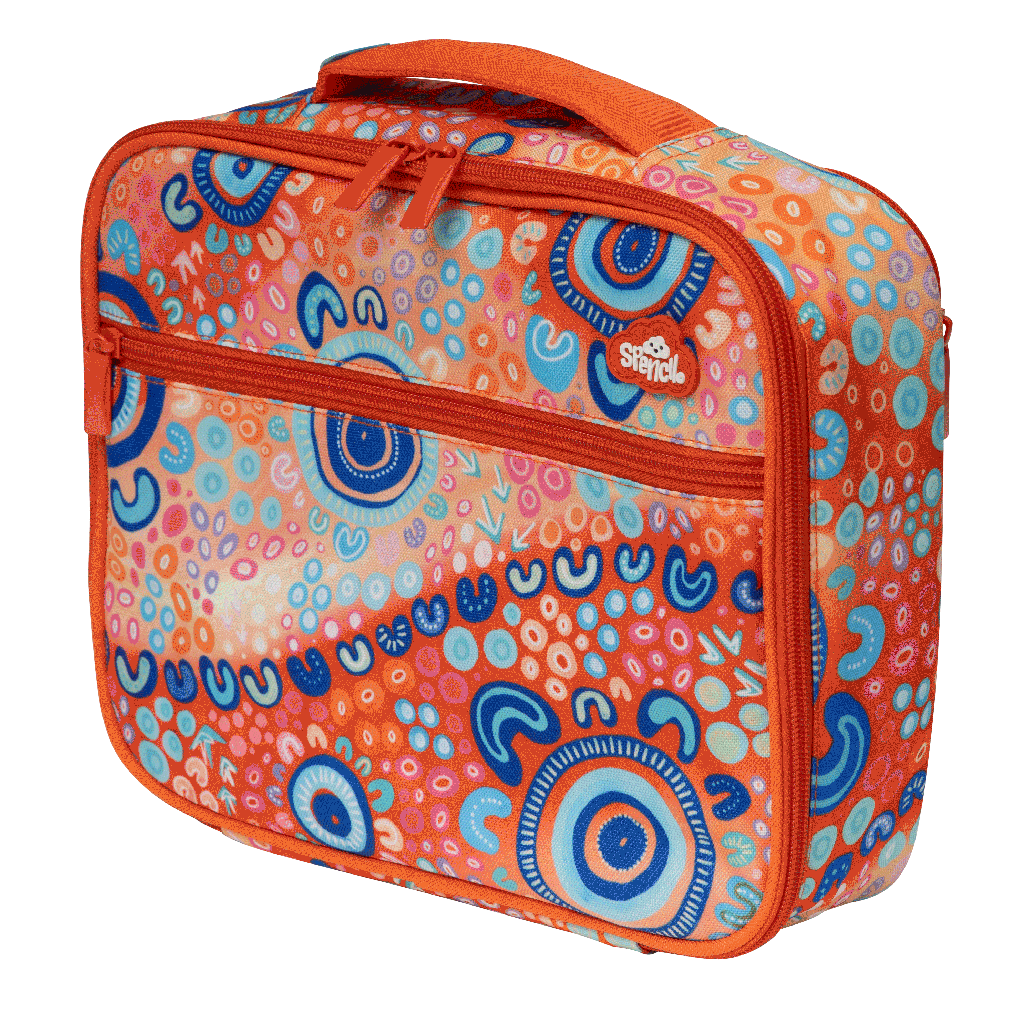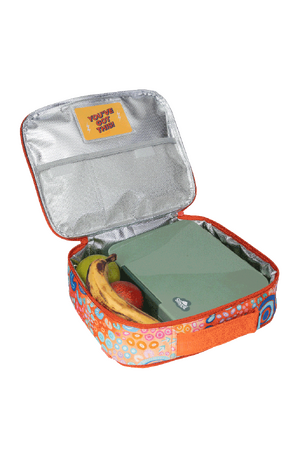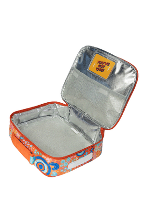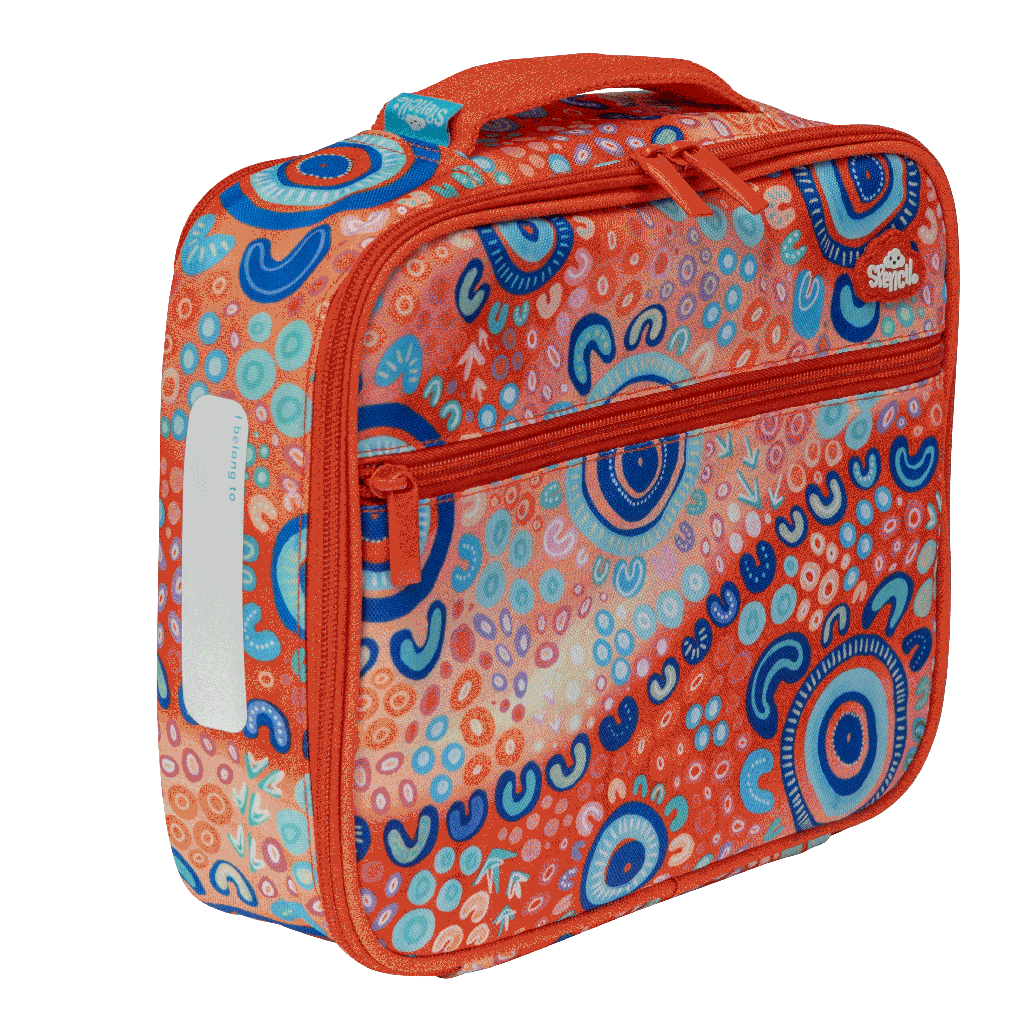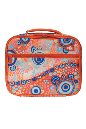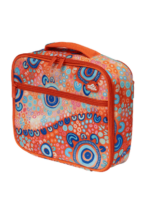 Big Cooler Lunch Bag - Ngootypoorteen: Bayley Mifsud, the artist behind Merindah-Gunya, creates vibrant Aboriginal art that celebrates culture and storytelling. Her piece "Ngootypoorteen" beautifully illustrates the journey of children through their childhood, focusing on growth, friendship, and a deep connection to the land. The artwork reflects Bayley’s passion for expressing the beauty and significance of Aboriginal culture and traditions through contemporary art. Her work invites her audience to explore the stories woven into each piece, offering a colourful and meaningful connection to the rich heritage she represents.