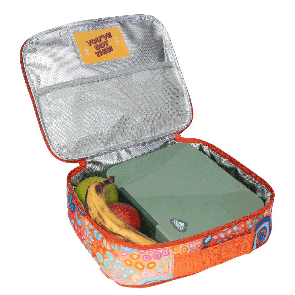 The Big Cooler Lunch Bag is the ideal bigger size- with extra room for fruit or small containers! With aluminium food-safe silver lining, a back zip pocket that perfectly fits the Big Chill Pack, outside name card pocket and an additional inside pocket for 'Love Notes' this is your go-to lunch bag for school and play!