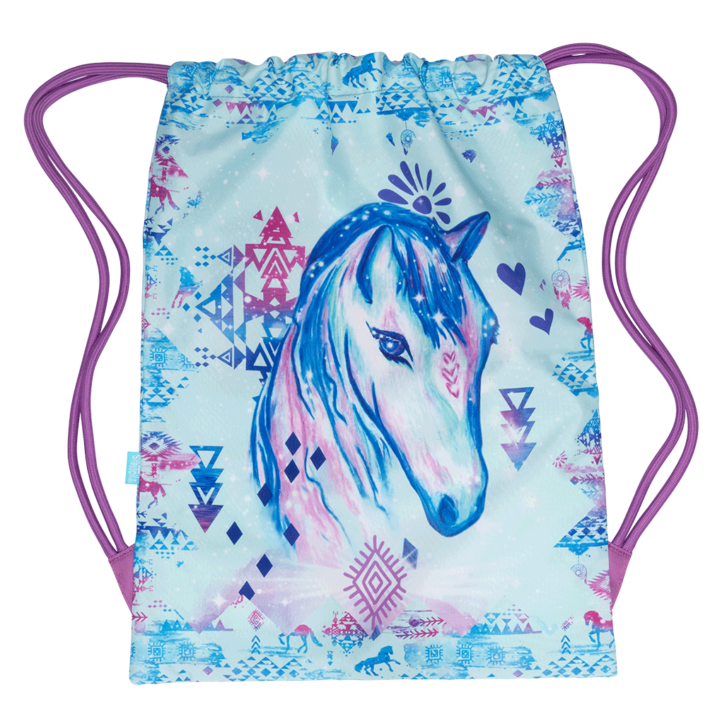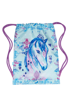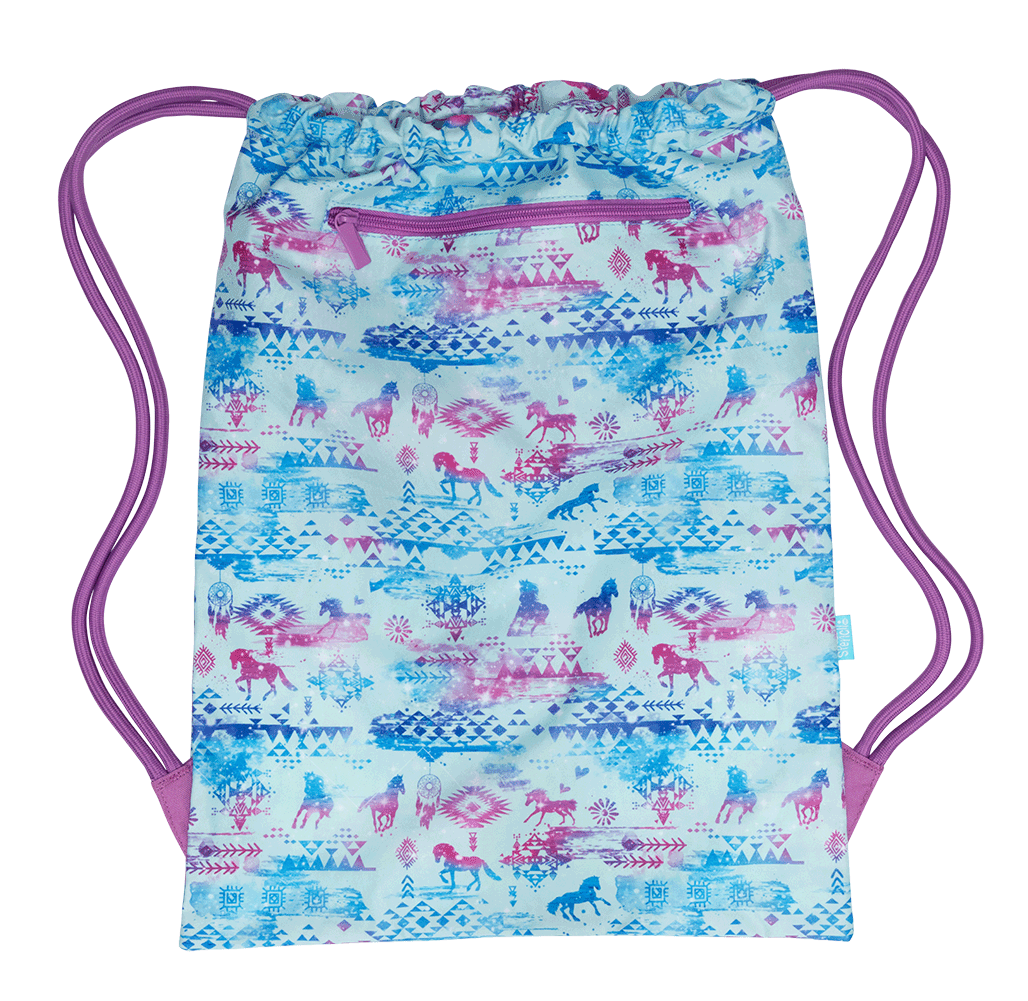 Big Drawstring Bag - Aztec Horse: The perfect print for horsie kids, with pastel tones, dreamcatchers and proud Aztec ponies. The go-anywhere, carry-all, multi-purpose bag that has any occasion covered! Designed for primary and tween kids, the Big Drawstring Bag is made with water-resistant fabric, perfect for sport, swimming and adventures and has a convenient zipped pocket feature to safeguard wallets, passes, keys, and coins. The functional single pocket, drawstring design makes this bag quick and easy to pack, open and close
