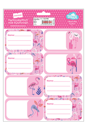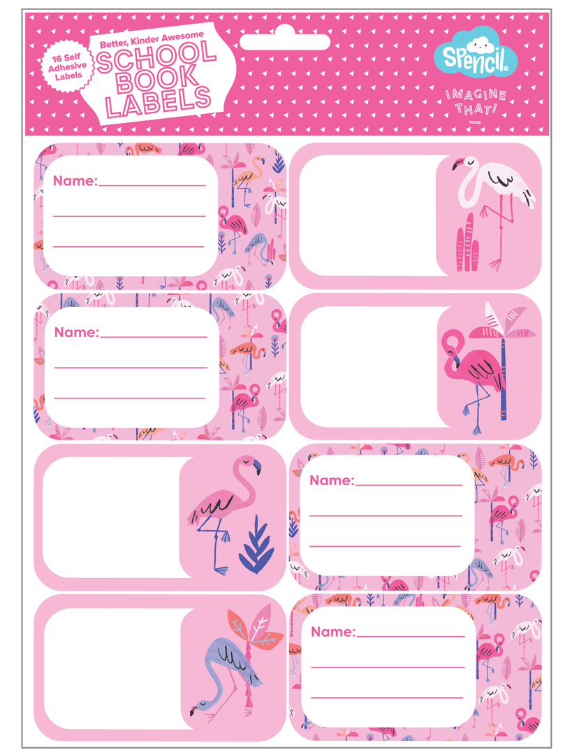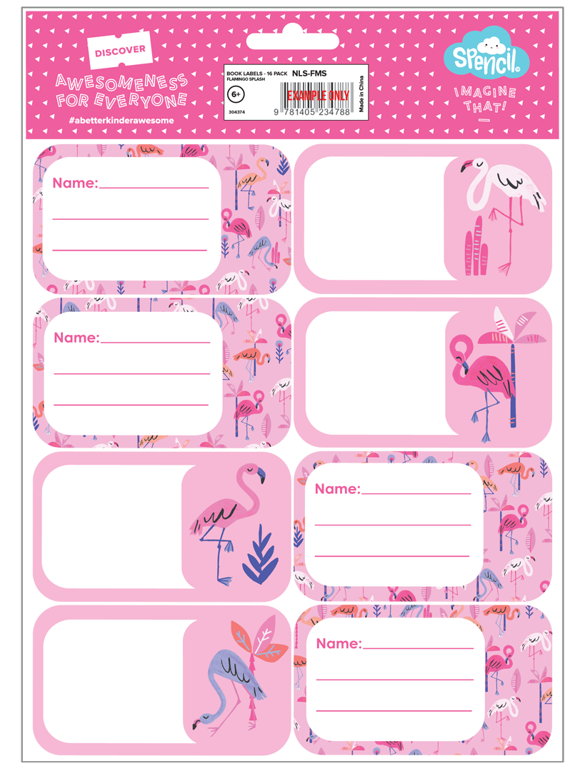 Book Labels - Flamingo Splash: Flamingos, fun, and a whole lot of pink! Flamingo Splash is bursting with bold hues-perfect for kids who love to stand out and strut their stuff. It's tropical, bright, and made to shine! The kiddos will never mix up their books again with these gorgeous book name labels. Not your average plain label, the cute designs bring a bit of fun into the school day! With blank and lined options for easy writing, there is space for your kid's name and subject on each of the 16 assorted labels. Perfect for school books as well as Spencil book covers to make them even more re-useable, year after year!