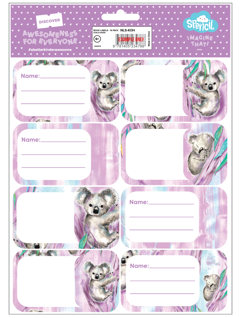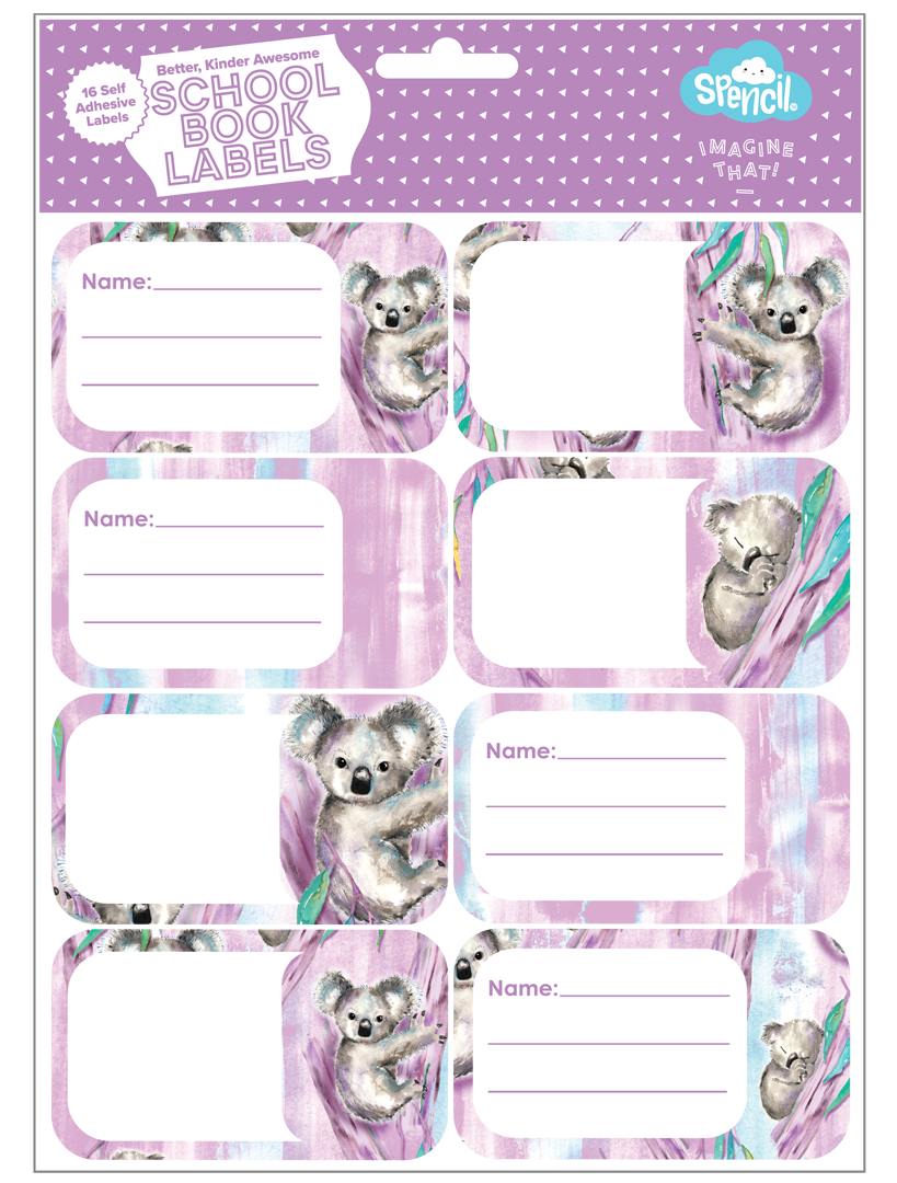 Book Labels - Koala Haven: Snuggly, sleepy, and oh-so-sweet these cuddly koalas are hanging out just for you! With soft water colour vibes and dreamy pastels, Koala Haven is like a gentle Aussie hug The kiddos will never mix up their books again with these gorgeous book name labels. Not your average plain label, the cute designs bring a bit of fun into the school day! With blank and lined options for easy writing, there is space for your kid's name and subject on each of the 16 assorted labels. Perfect for school books as well as Spencil book covers to make them even more re-useable, year after year!
