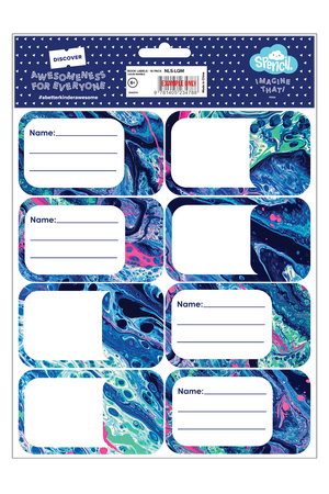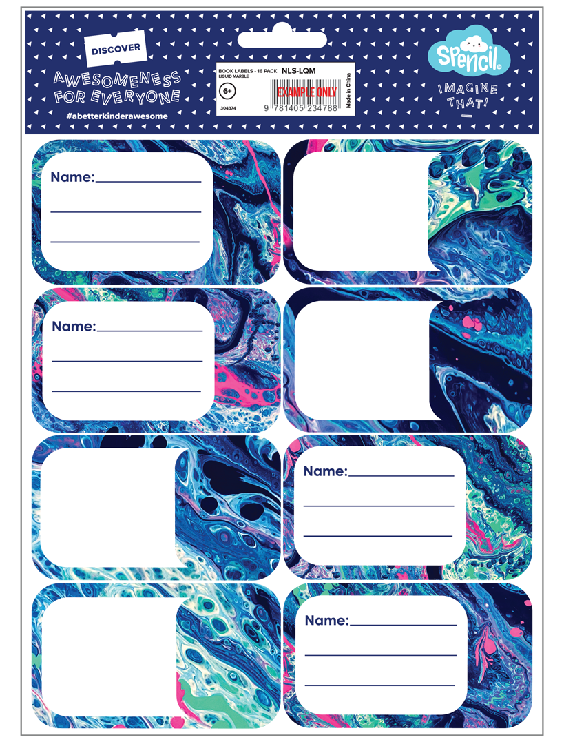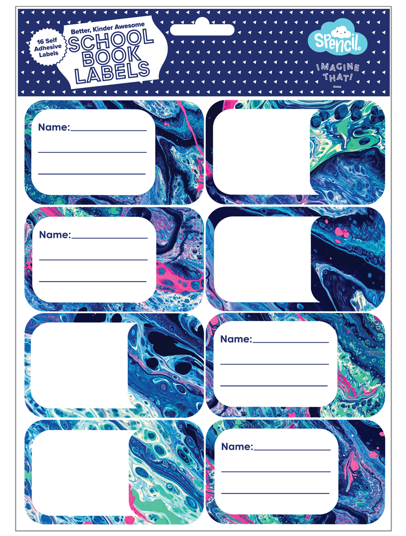 Book Labels - Liquid Marble: Dive into a swirl of colour! Liquid Marble mixes neons and navy in a paint-pour explosion that's full of energy. With drips, splashes and marbled magic, it's made for kids who love to get creative and a little bit messy (in the best way!). The kiddos will never mix up their books again with these gorgeous book name labels. Not your average plain label, the cute designs bring a bit of fun into the school day! With blank and lined options for easy writing, there is space for your kid's name and subject on each of the 16 assorted labels. Perfect for school books as well as Spencil book covers to make them even more re-useable, year after year!