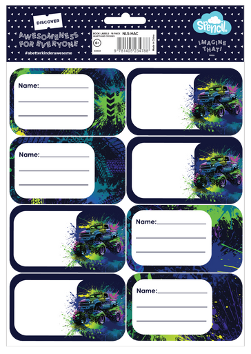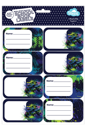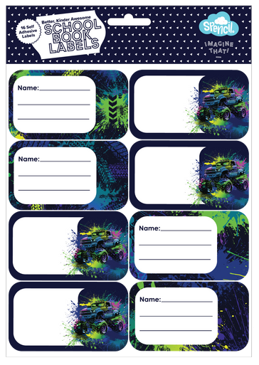Book Labels - Mega Wheels: Rev up with Mega Wheels! Featuring a bold design of monster trucks and massive wheels, this one is for the thrill-seekers and adrenaline junkies. Perfect for those who love to crush each day and ride high over any obstacle! The kiddos will never mix up their books again with these gorgeous book name labels. Not your average plain label, the cute designs bring a bit of fun into the school day! With blank and lined options for easy writing, there is space for your kid's name and subject on each of the 16 assorted labels. Perfect for school books as well as Spencil book covers to make them even more re-useable, year after year!
