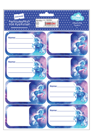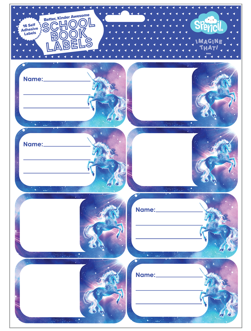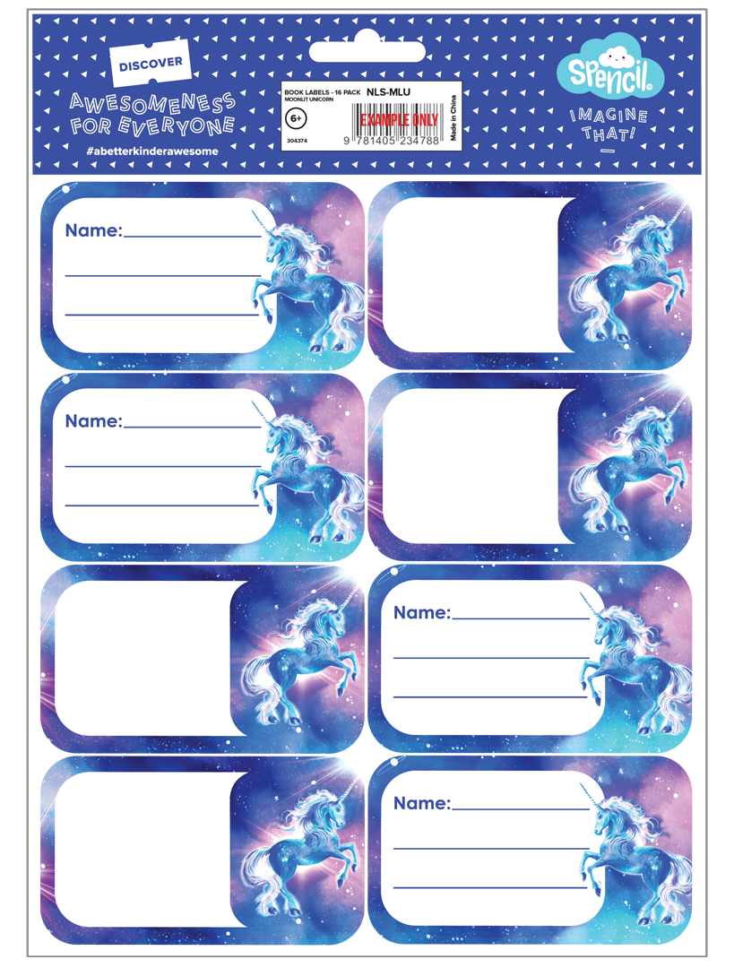 Book Labels - Moonlit Unicorn: Under a starlit sky, magic comes to life! Moonlit Unicorn is a dreamy swirl of twilight colours, sparkling stars and one truly majestic unicorn. It's pure enchantment for kids who believe in a universe full of wonder. The kiddos will never mix up their books again with these gorgeous book name labels. Not your average plain label, the cute designs bring a bit of fun into the school day! With blank and lined options for easy writing, there is space for your kid's name and subject on each of the 16 assorted labels. Perfect for school books as well as Spencil book covers to make them even more re-useable, year after year!