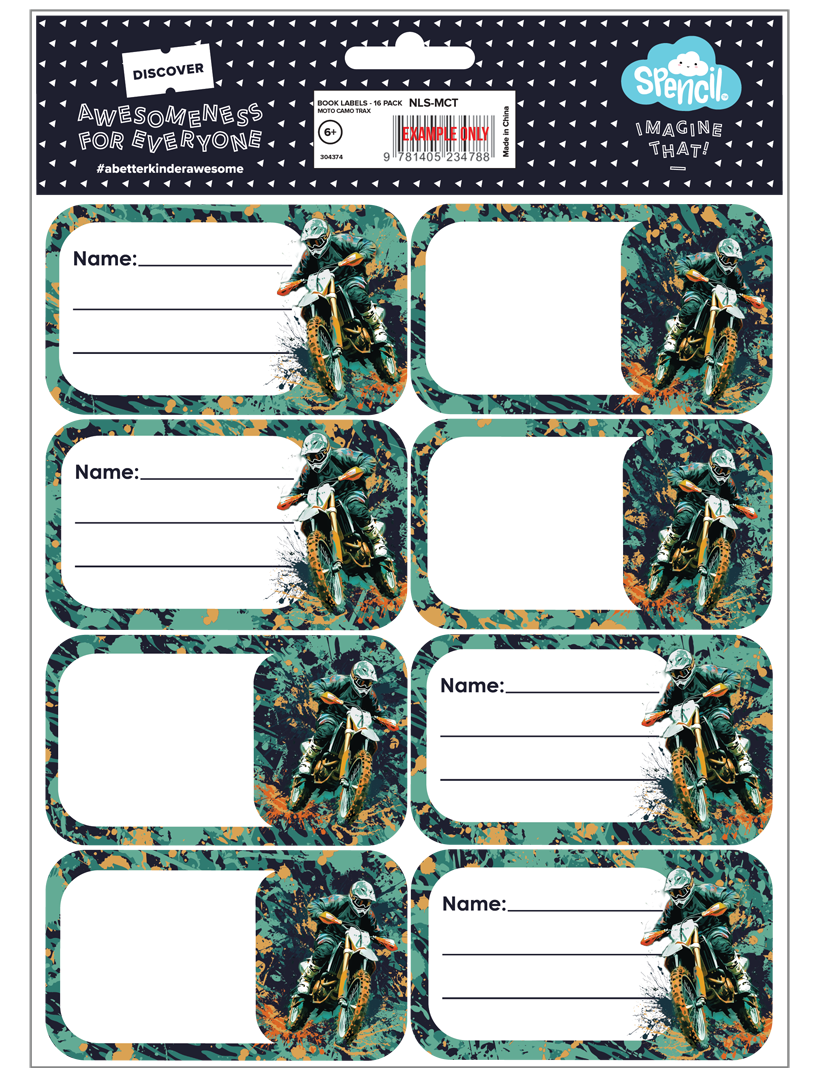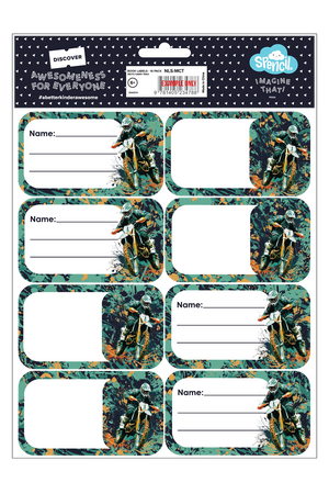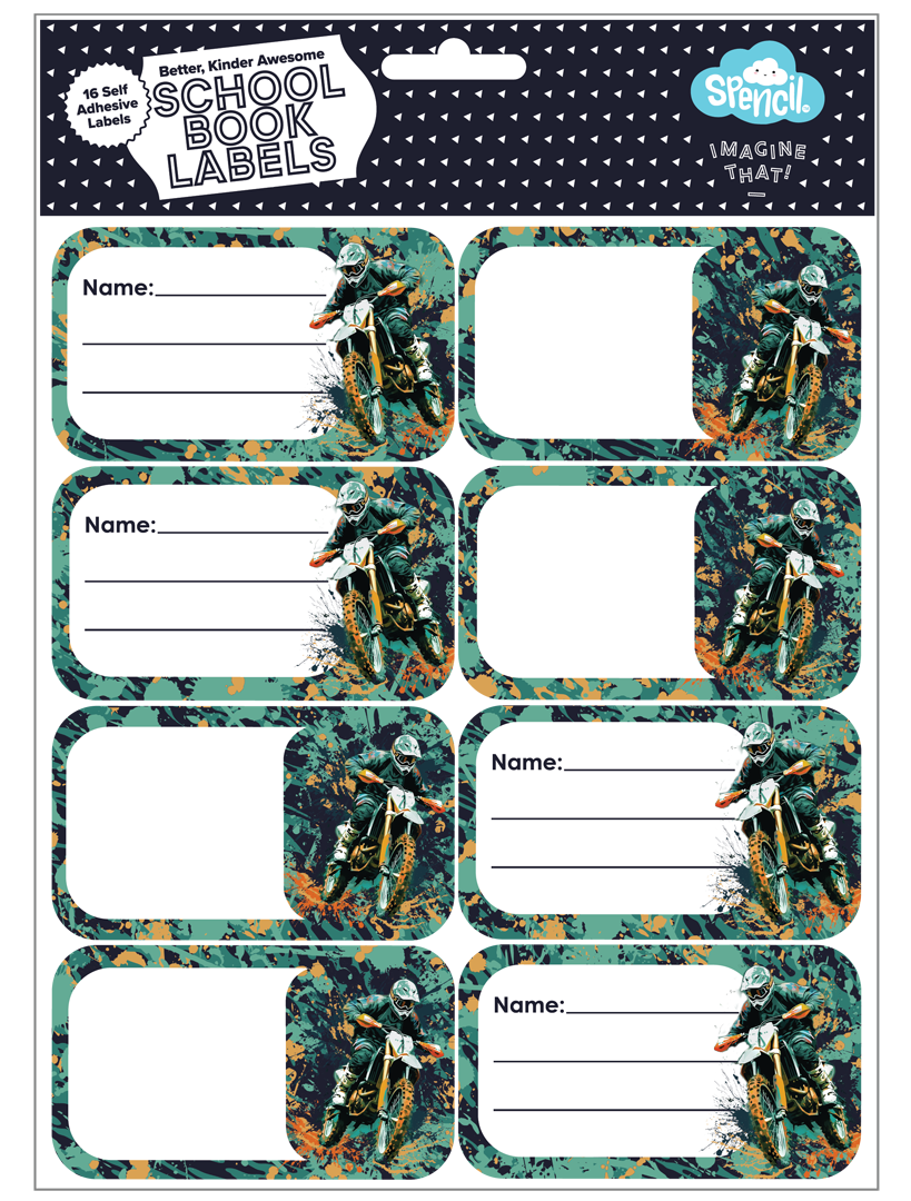 Book Labels - Moto Camo Trax: Packed with wild colours and rugged vibes, Moto Camo Trax is made for kids who love the thrill of biking and aren't afraid to get a little muddy along the way. Adventure-ready and full of fun! The kiddos will never mix up their books again with these gorgeous book name labels. Not your average plain label, the cute designs bring a bit of fun into the school day! With blank and lined options for easy writing, there is space for your kid's name and subject on each of the 16 assorted labels. Perfect for school books as well as Spencil book covers to make them even more re-useable, year after year!