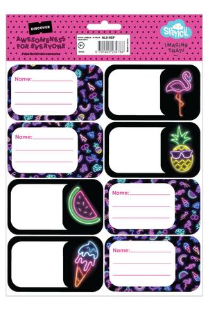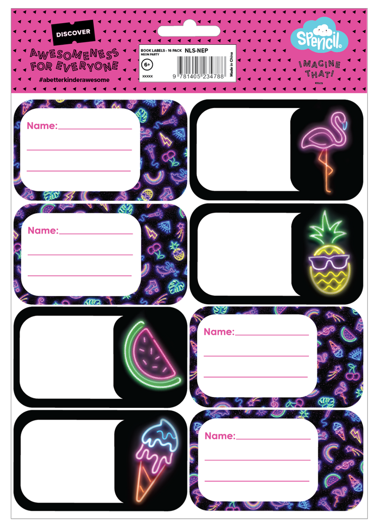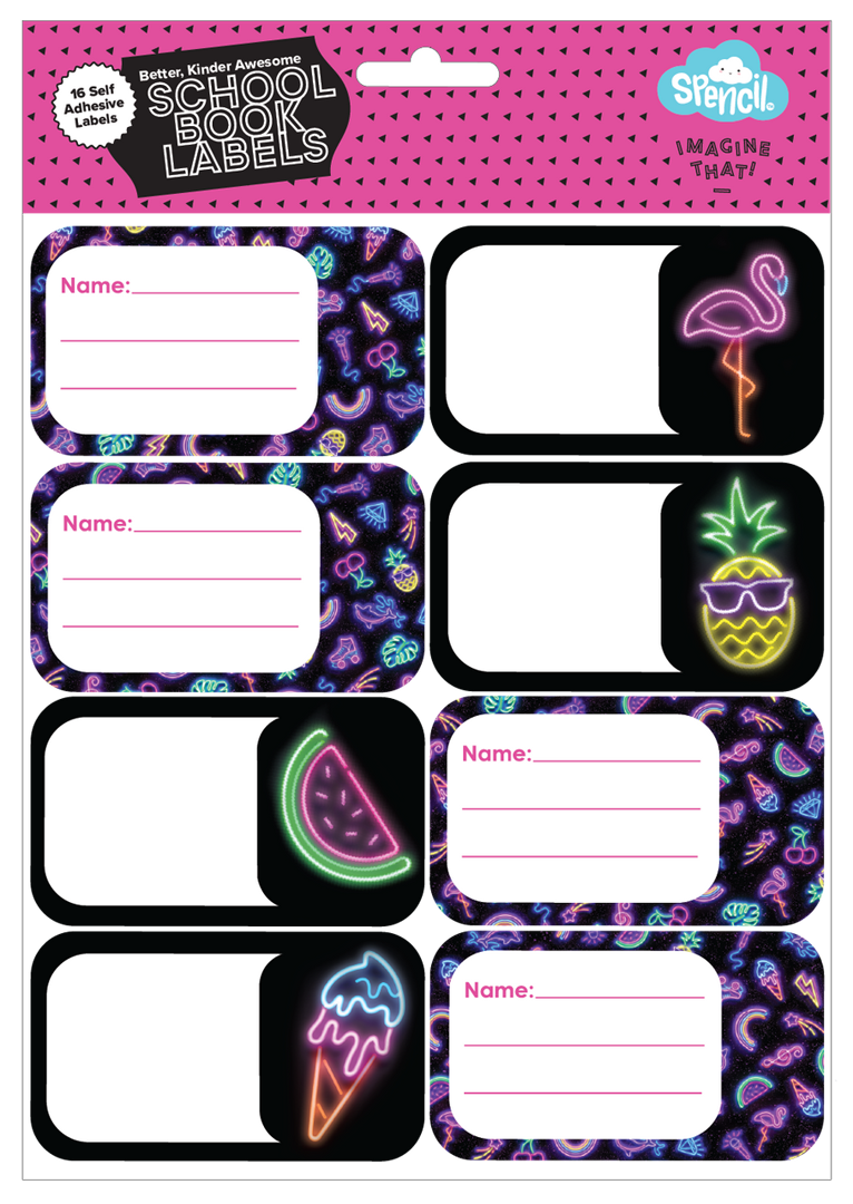 90s cool is back – neon style! This flouro- tastic design will have your little groovers rockin’ through their day! With electrifying colours and playful elements, it’ll make you want to party like it’s 1999! The kiddos will never mix up their books again with these gorgeous book name labels. Not your average plain label, the cute designs bring a bit of fun into the school day! With blank and lined options for easy writing, there is space for your kid's name and subject on each of the 16 assorted labels. Perfect for school books as well as Spencil book covers to make them even more re-useable, year after year!