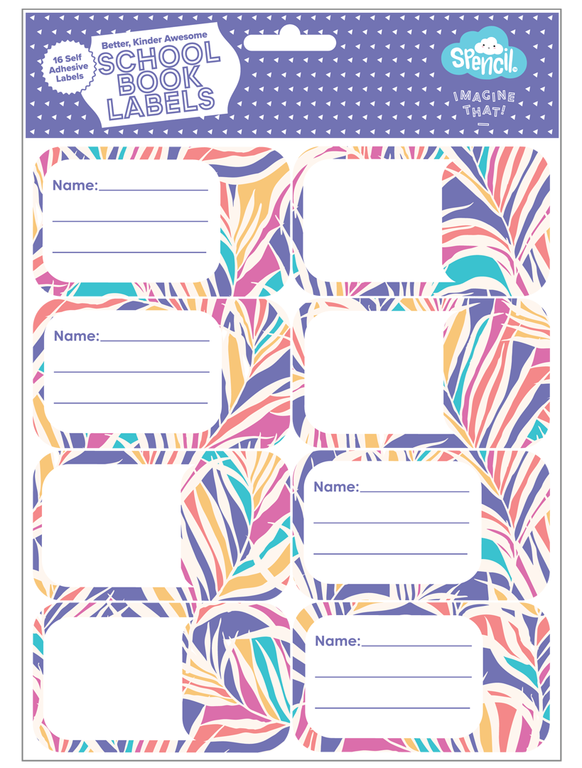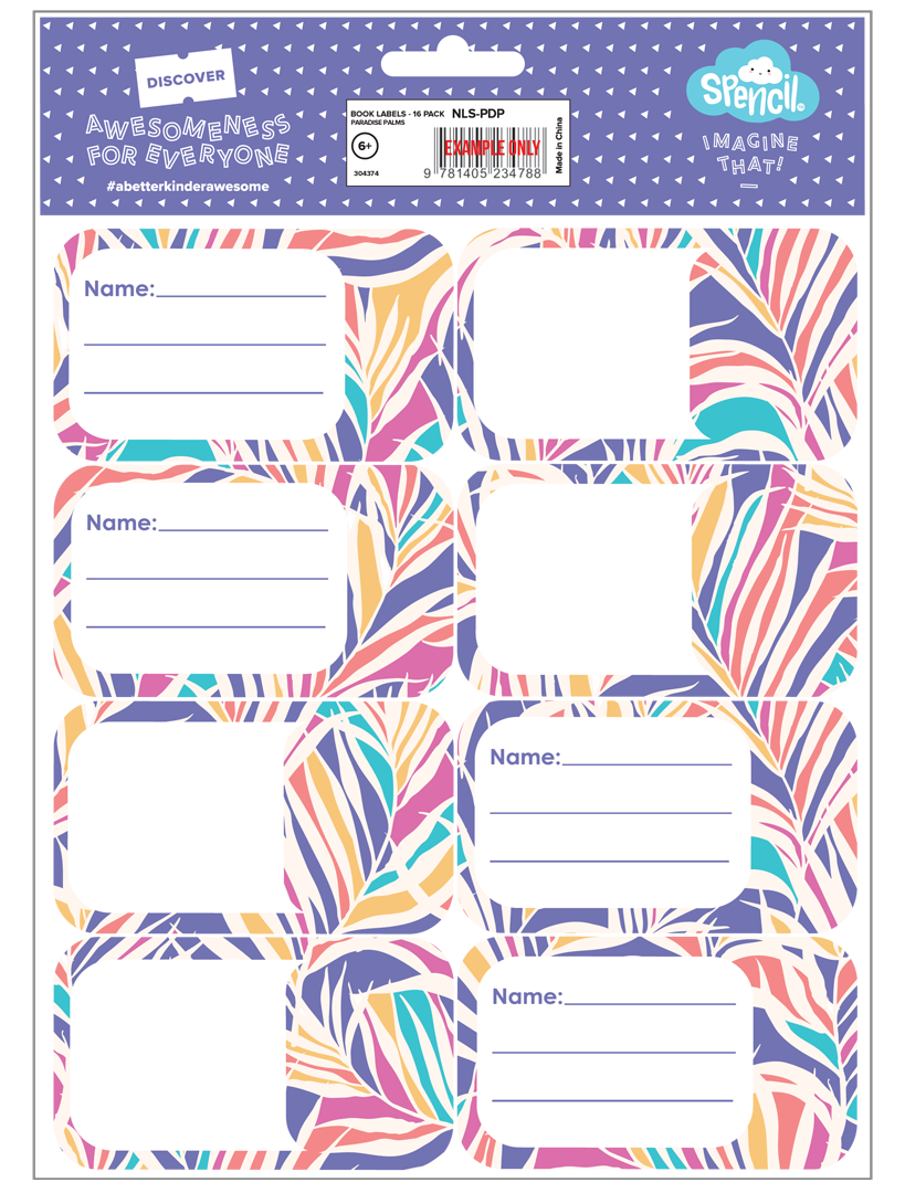 Book Labels - Paradise Palms: Say hello to island vibes! Paradise Palms is all about tropical feels and that sunshiney holiday mood. It's bright, breezy and perfect for kids who love a little summer fun in every day! The kiddos will never mix up their books again with these gorgeous book name labels. Not your average plain label, the cute designs bring a bit of fun into the school day! With blank and lined options for easy writing, there is space for your kid's name and subject on each of the 16 assorted labels. Perfect for school books as well as Spencil book covers to make them even more re-useable, year after year!