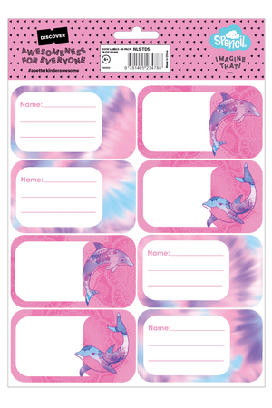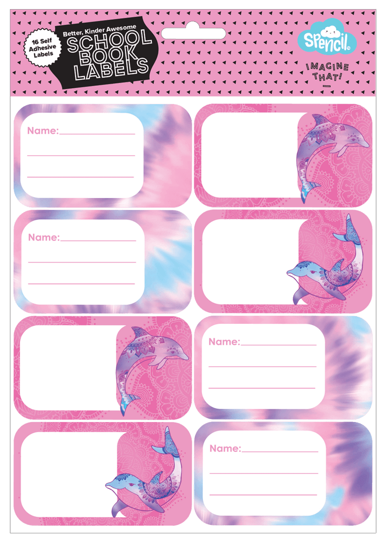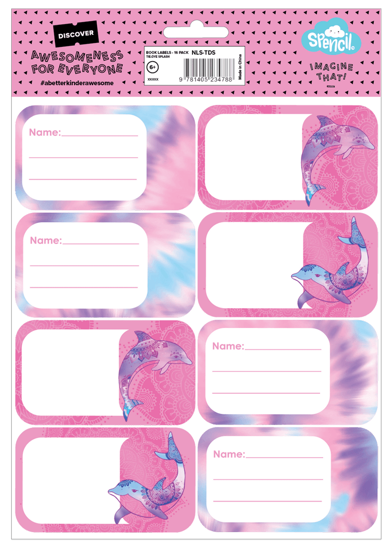 Book Labels - Tie Dye Splash: Make a splash with Tie-Dye Splash! This design swirls together pastel tones with playful dolphins dancing through the waves. Perfect for those who love the ocean and want to ride the wave of fun and colour! The kiddos will never mix up their books again with these gorgeous book name labels. Not your average plain label, the cute designs bring a bit of fun into the school day! With blank and lined options for easy writing, there is space for your kid's name and subject on each of the 16 assorted labels. Perfect for school books as well as Spencil book covers to make them even more re-useable, year after year!