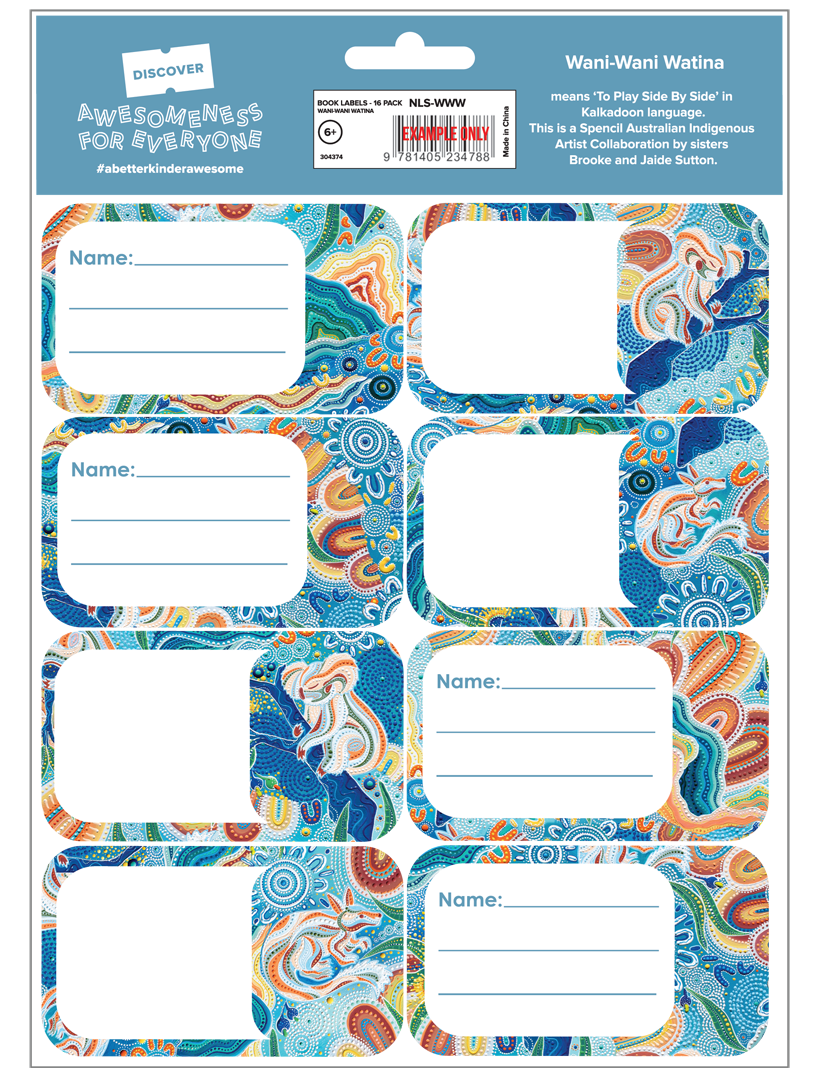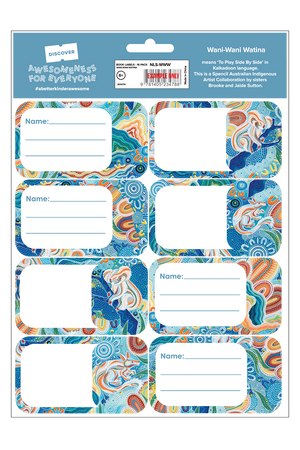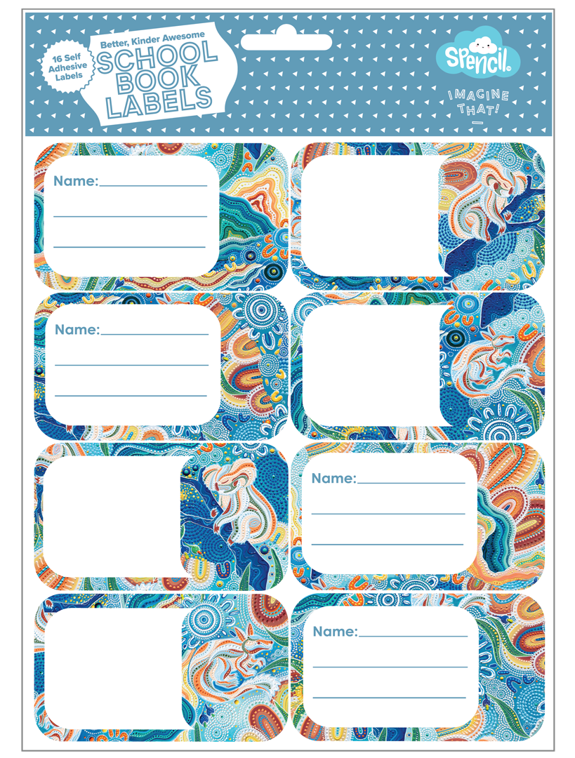 Book Labels - Wani-Wani Watina: Wani-Wani Watina means 'To Play Side By Side' in the Kalkadoon language- a beautiful reminder of friendship and togetherness. Created by Indigenous artist sisters Brooke and Jaide Sutton for our newest Spencil Australian Indigenous Artist Collaboration, this design features charming koalas and bilbies in soft, hand-drawn detail. Each piece in the range is a celebration of wildlife and culture and a testament to the sisters' exquisite artistry. The kiddos will never mix up their books again with these gorgeous book name labels. Not your average plain label, the cute designs bring a bit of fun into the school day! With blank and lined options for easy writing, there is space for your kid's name and subject on each of the 16 assorted labels. Perfect for school books as well as Spencil book covers to make them even more re-useable, year after year!