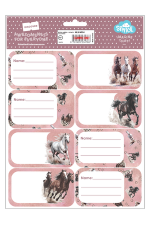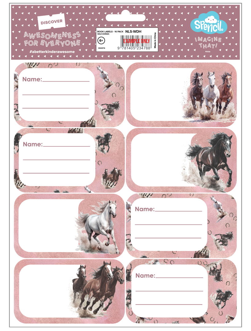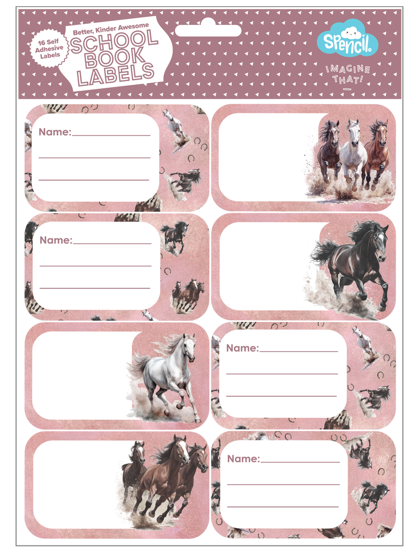 Book Labels - Wild Horses: For every horse-loving kid with a wild heart and big imagination - this one's for you. Wild Horses gallops into a dreamy world where ponies run free across soft, dusty pink skies. It's warm, whimsical, and full of freedom. The kiddos will never mix up their books again with these gorgeous book name labels. Not your average plain label, the cute designs bring a bit of fun into the school day! With blank and lined options for easy writing, there is space for your kid's name and subject on each of the 16 assorted labels. Perfect for school books as well as Spencil book covers to make them even more re-useable, year after year!