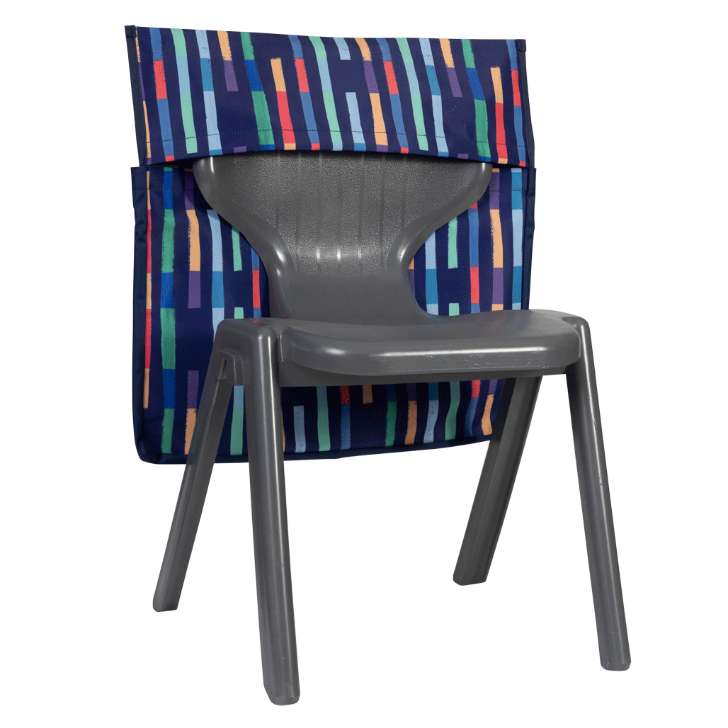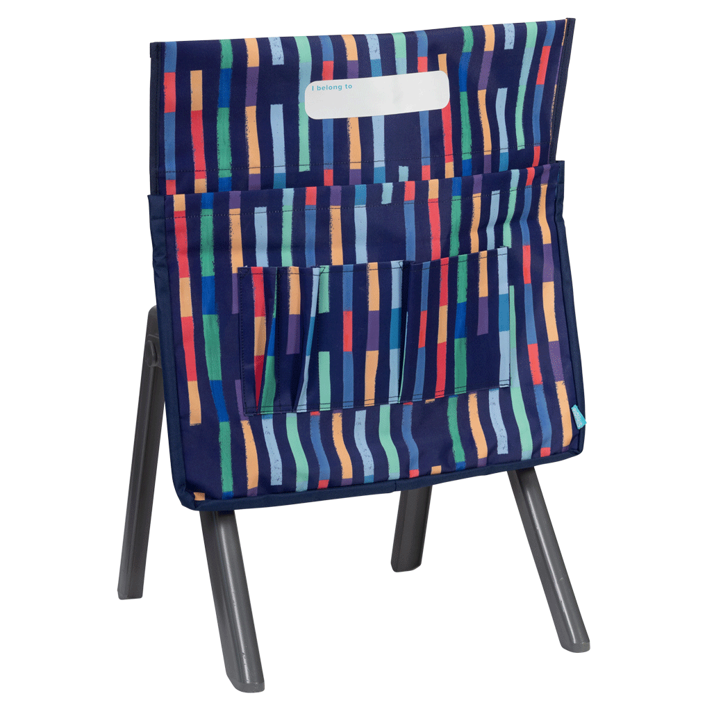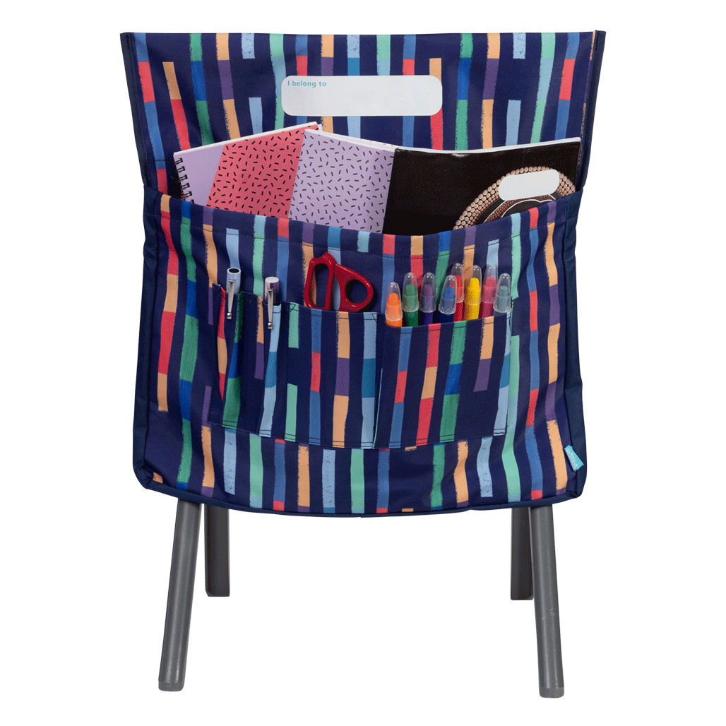 Adjustable velcro tabs allow chair bag to fit most school and kids chairs Back pocket storage Large name label, front and centre, for easy identification 35 mm gusset for awesome roominess Extra strong reinforced box stitching and inside binding for durability Additional front stationery pockets (4) to keep your pens and pencils handy