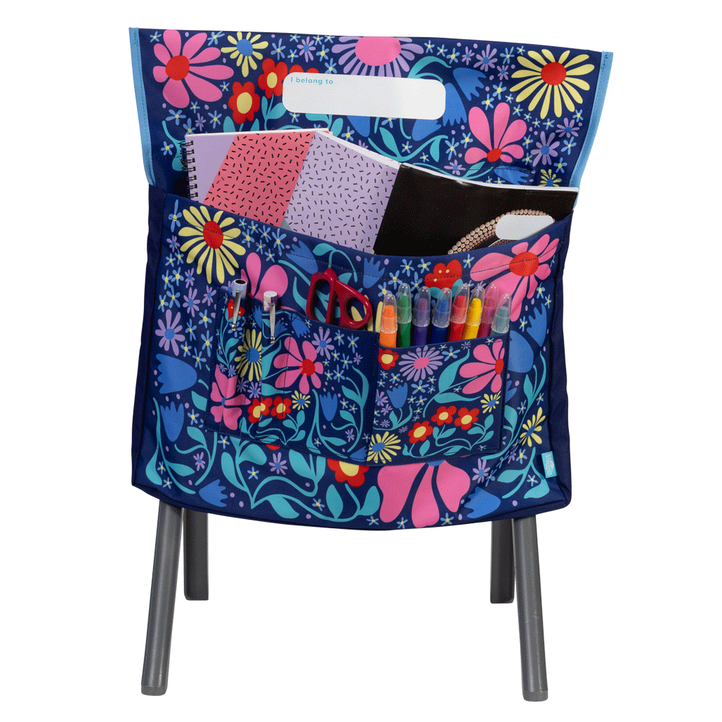 Adjustable velcro tabs allow chair bag to fit most school and kids chairs Back pocket storage Large name label, front and centre, for easy identification 35 mm gusset for awesome roominess Extra strong reinforced box stitching and inside binding for durability Additional front stationery pockets (4) to keep your pens and pencils handy