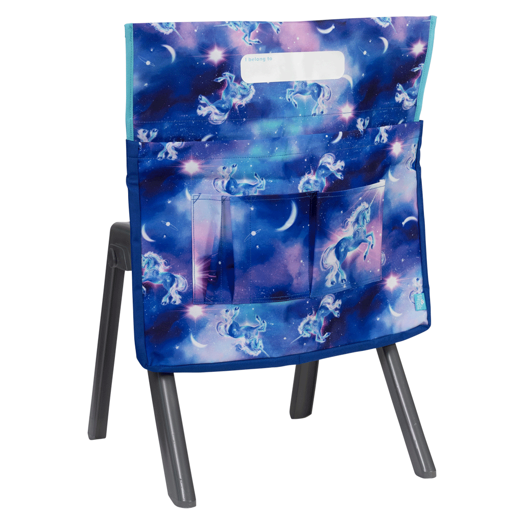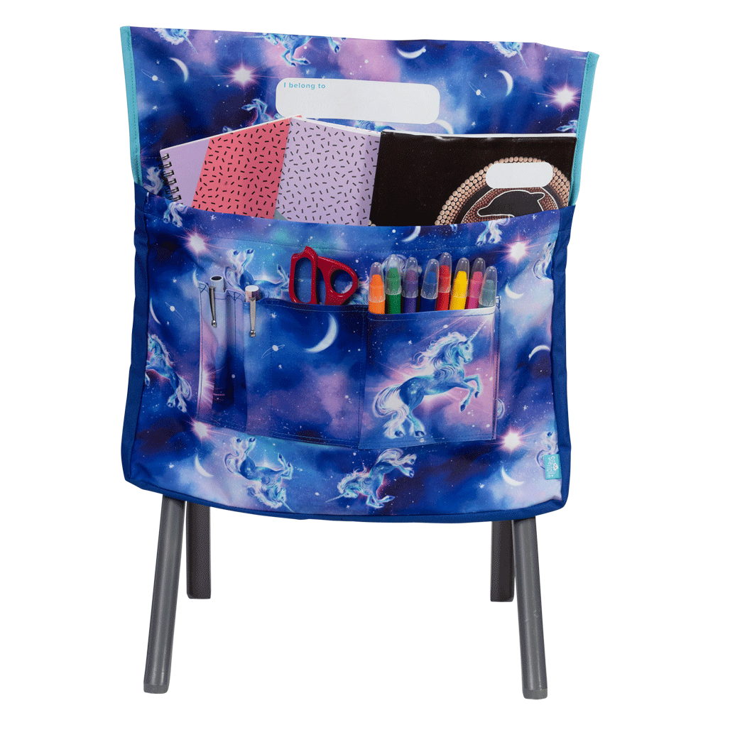 Adjustable velcro tabs allow chair bag to fit most school and kids chairs Back pocket storage Large name label, front and centre, for easy identification 35 mm gusset for awesome roominess Extra strong reinforced box stitching and inside binding for durability Additional front stationery pockets (4) to keep your pens and pencils handy