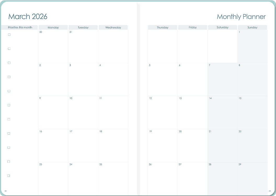 - One-colour “Cool Blue” printed pages for simplicity