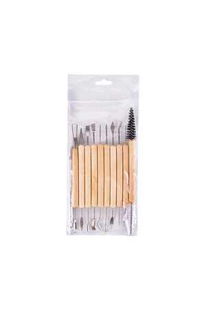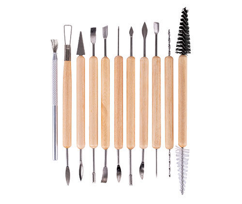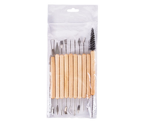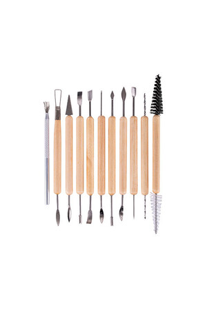 Eleven durable wooden handled tools with 20 assorted stainless steel tips. Great for carving, decorating and cleaning up damp and dry greenware. Plastic wallet. Tools vary in length from 15.5 - 20cm.