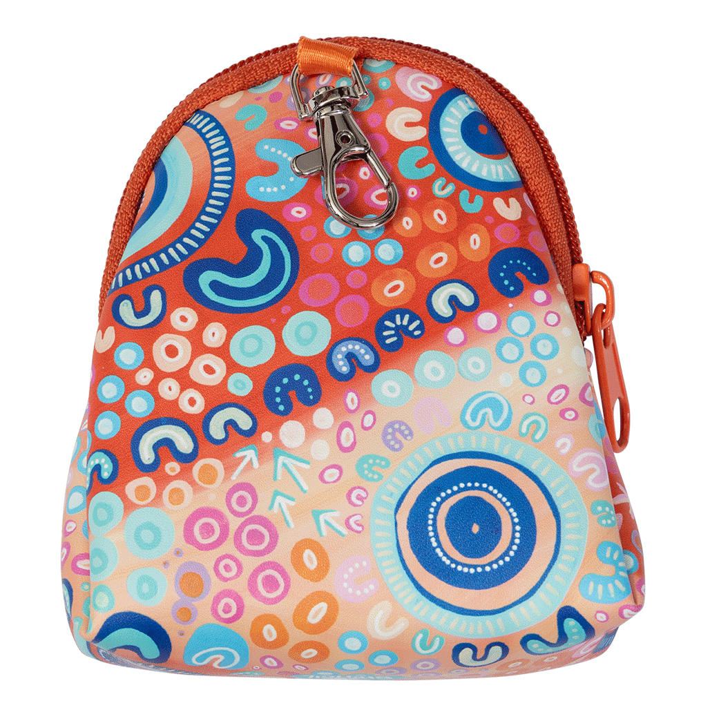 Coin Pouch - Ngootypoorteen: Bayley Mifsud, the artist behind Merindah-Gunya, creates vibrant Aboriginal art that celebrates culture and storytelling. Her piece "Ngootypoorteen" beautifully illustrates the journey of children through their childhood, focusing on growth, friendship, and a deep connection to the land. The artwork reflects Bayley’s passion for expressing the beauty and significance of Aboriginal culture and traditions through contemporary art. Her work invites her audience to explore the stories woven into each piece, offering a colourful and meaningful connection to the rich heritage she represents.
