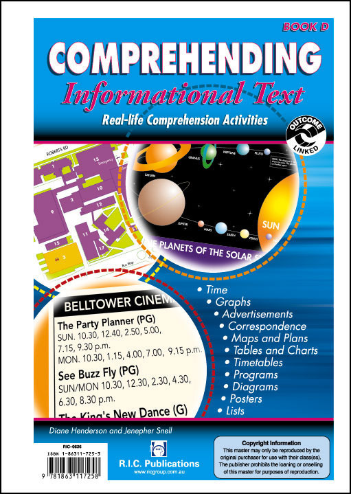 Comprehending Informational Text is a series of seven blackline masters which provide opportunities for students to locate and interpret information from a variety of informational (expository) texts. The books progress in level of difficulty using appropriate language and activities to suit each level.