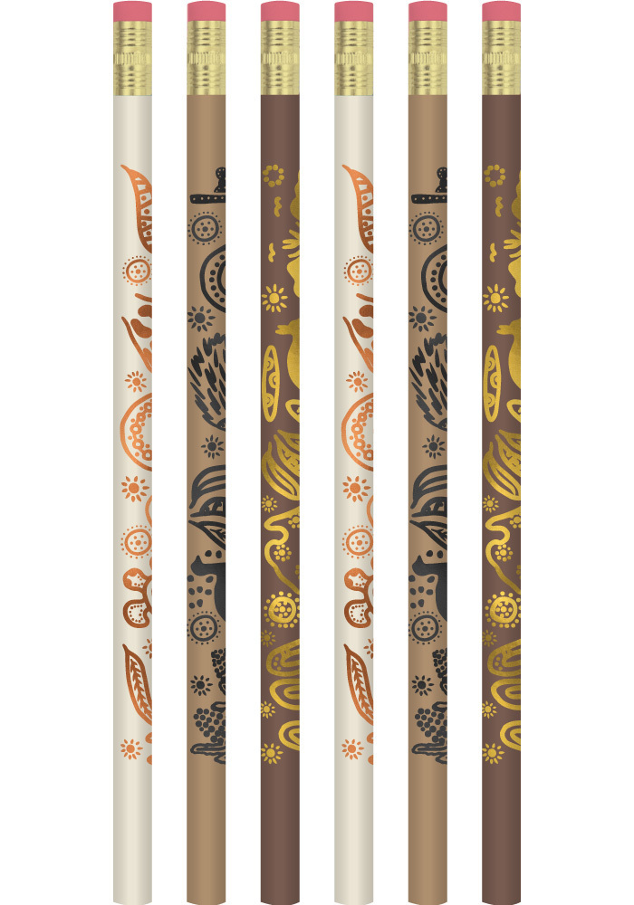 Reward students with these Country Connections foiled pencils featuring artwork by contemporary Aboriginal artist, Daisy Hill. This pack of 10 pencils can be used to encourage positive behaviours in the classroom or to recognise academic achievements. Each glitzy pencil has an eraser top and is suitable for a range of age groups.