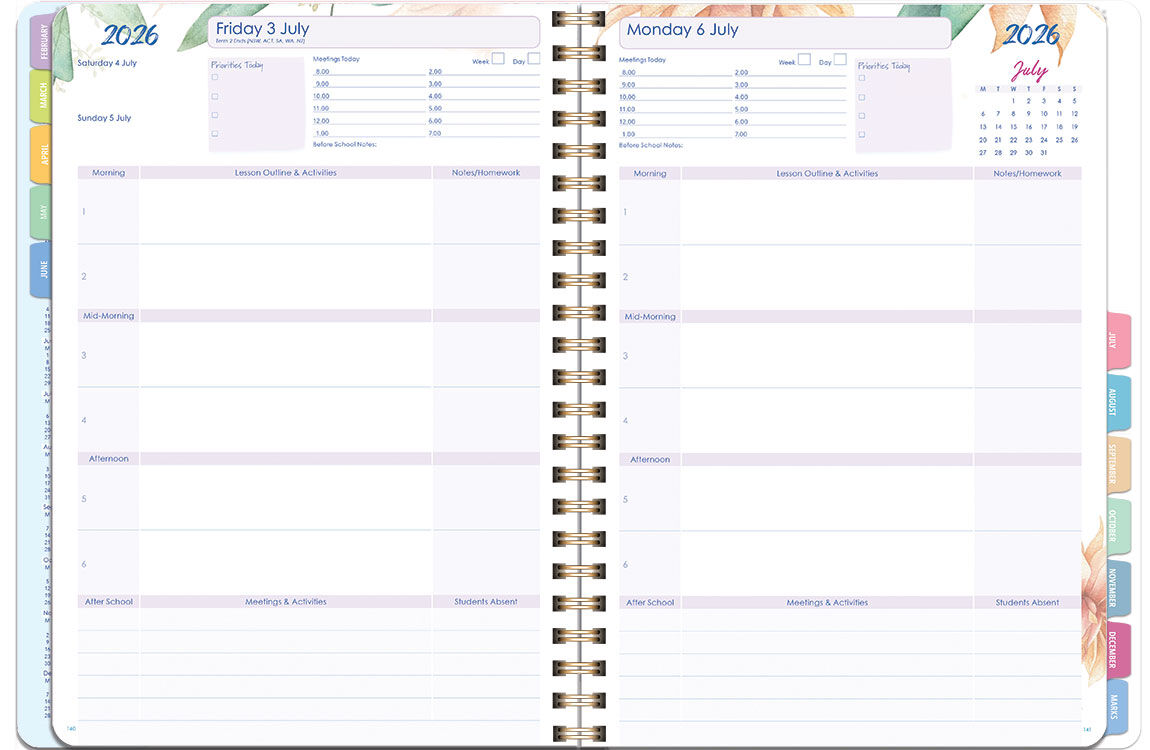 The Deluxe A5 Compact Planner 2026 (Daily) – Snowgums is a beautifully designed, full-colour teacher planner in a convenient A5 size. Compact yet practical, it provides ample space for recording daily lessons, tasks, meetings, and notes, all while inspiring you with vibrant design and thoughtful details.