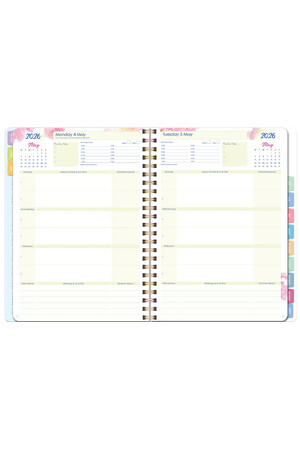 - Double-page monthly planners with tabs