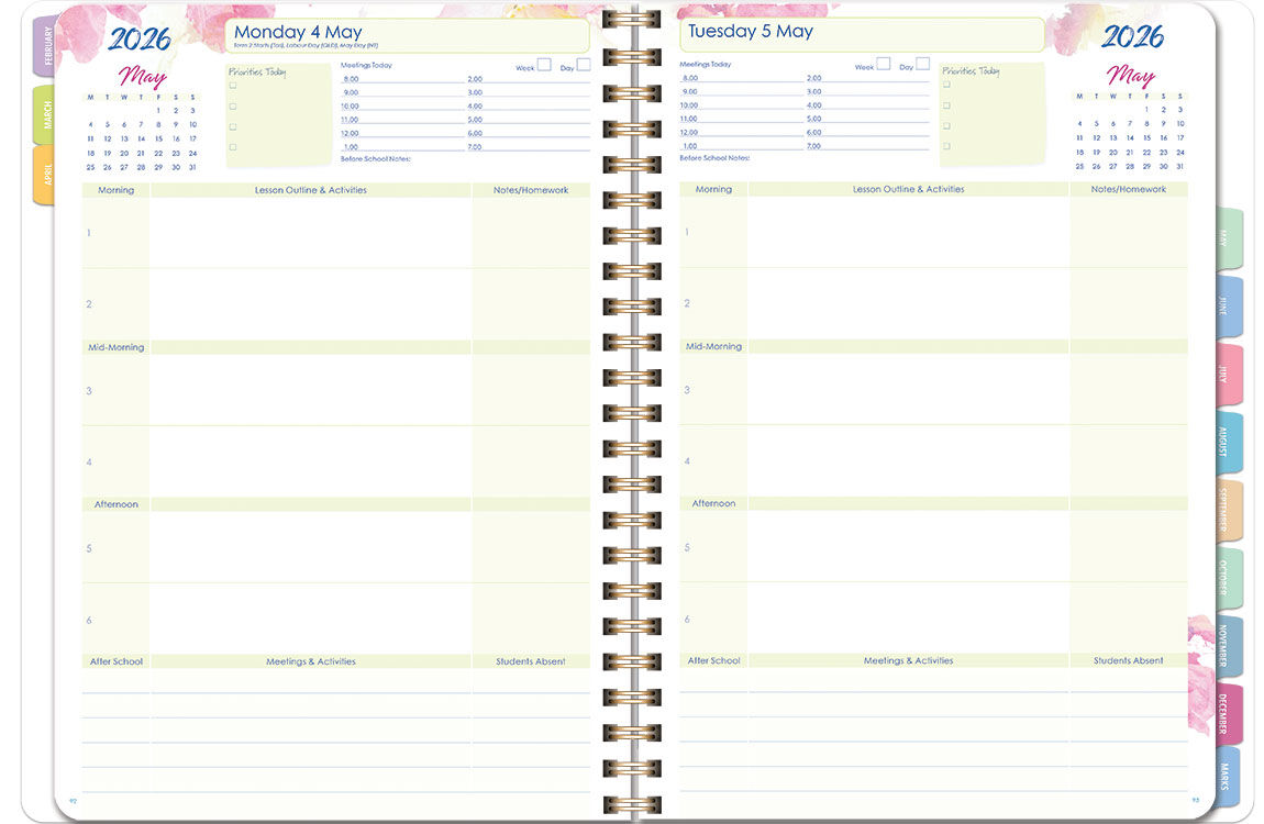 The Deluxe Primary Planner 2026 (Daily) – Bloom blends vibrant design with classroom practicality. Its day-to-a-page, 6-period layout gives you generous space for lessons, tasks, meetings, and notes—keeping you organised from term to term.