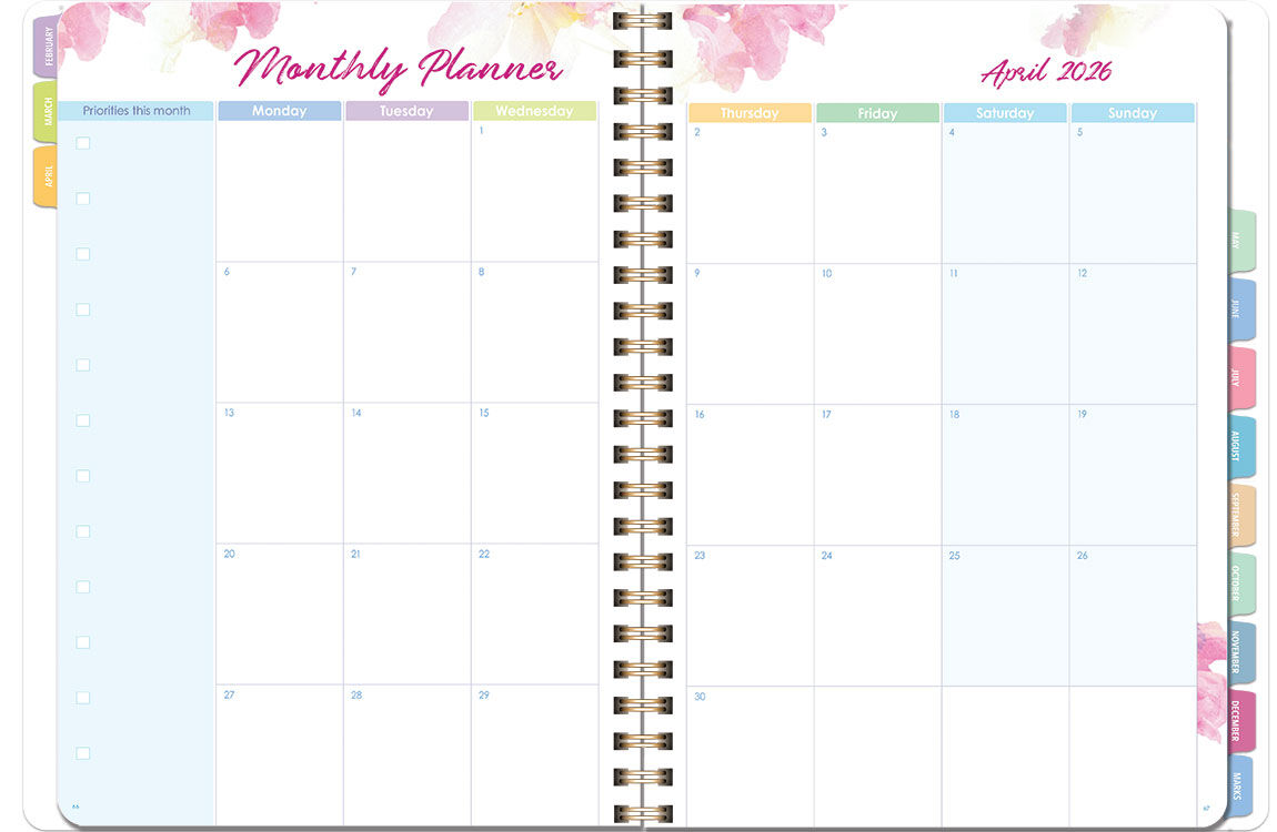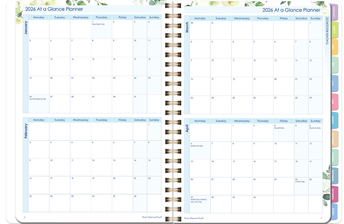 This planner includes 352 full-colour A4 pages, double-page monthly planners with tabs, and a PVC pocket for storing handouts and loose papers. It also comes with a durable clip-on polypropylene cover, gold double-loop wire binding, and a ribbon bookmark for added convenience. An excerpt of the Australian Professional Standards for Teachers is included, making it both stylish and functional.