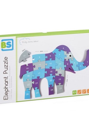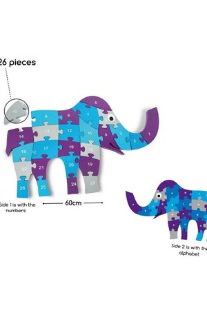Wooden puzzle of a elephant. One side is printed with letters and the other side with the alphabet to practice the numbers and letters.