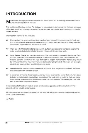 This workbook of fractions for Year 7 is designed to make students feel confident in the basic processes of fractions. It will help satisfy the needs of slower learners, and provide enrichment opportunities for quicker learners. The step-by-step explanations and the many practice exercises will guarantee students' understanding of the work.