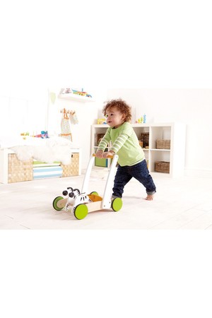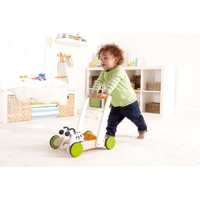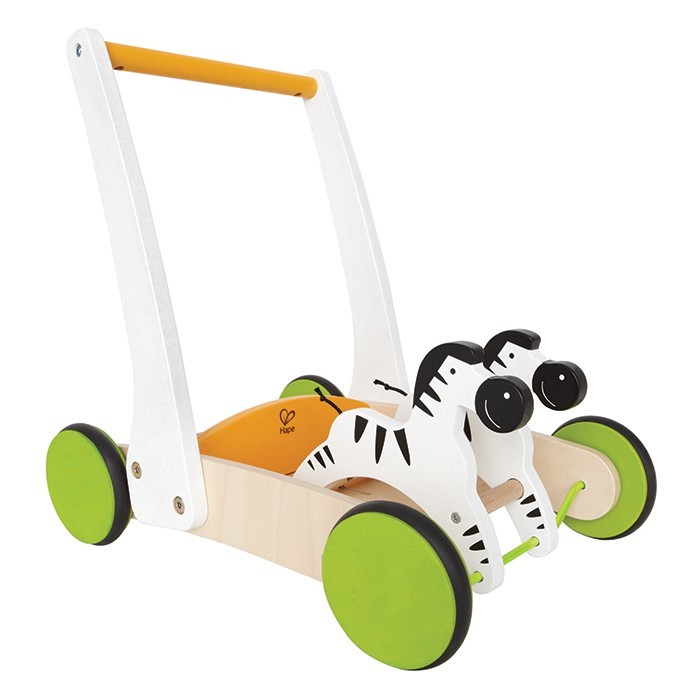 This walker cart features nodding zebras. Children will love the bright colours and simple design. Made from maple and plywood. Measures 40.5 H x 40 W x 27.5cm D. Ages 12mths+