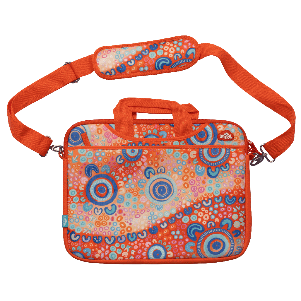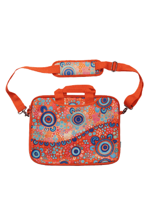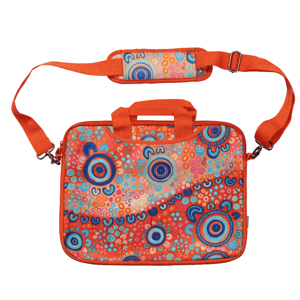 Laptop Bag - Ngootypoorteen: Bayley Mifsud, the artist behind Merindah-Gunya, creates vibrant Aboriginal art that celebrates culture and storytelling. Her piece "Ngootypoorteen" beautifully illustrates the journey of children through their childhood, focusing on growth, friendship, and a deep connection to the land. The artwork reflects Bayley’s passion for expressing the beauty and significance of Aboriginal culture and traditions through contemporary art. Her work invites her audience to explore the stories woven into each piece, offering a colourful and meaningful connection to the rich heritage she represents.